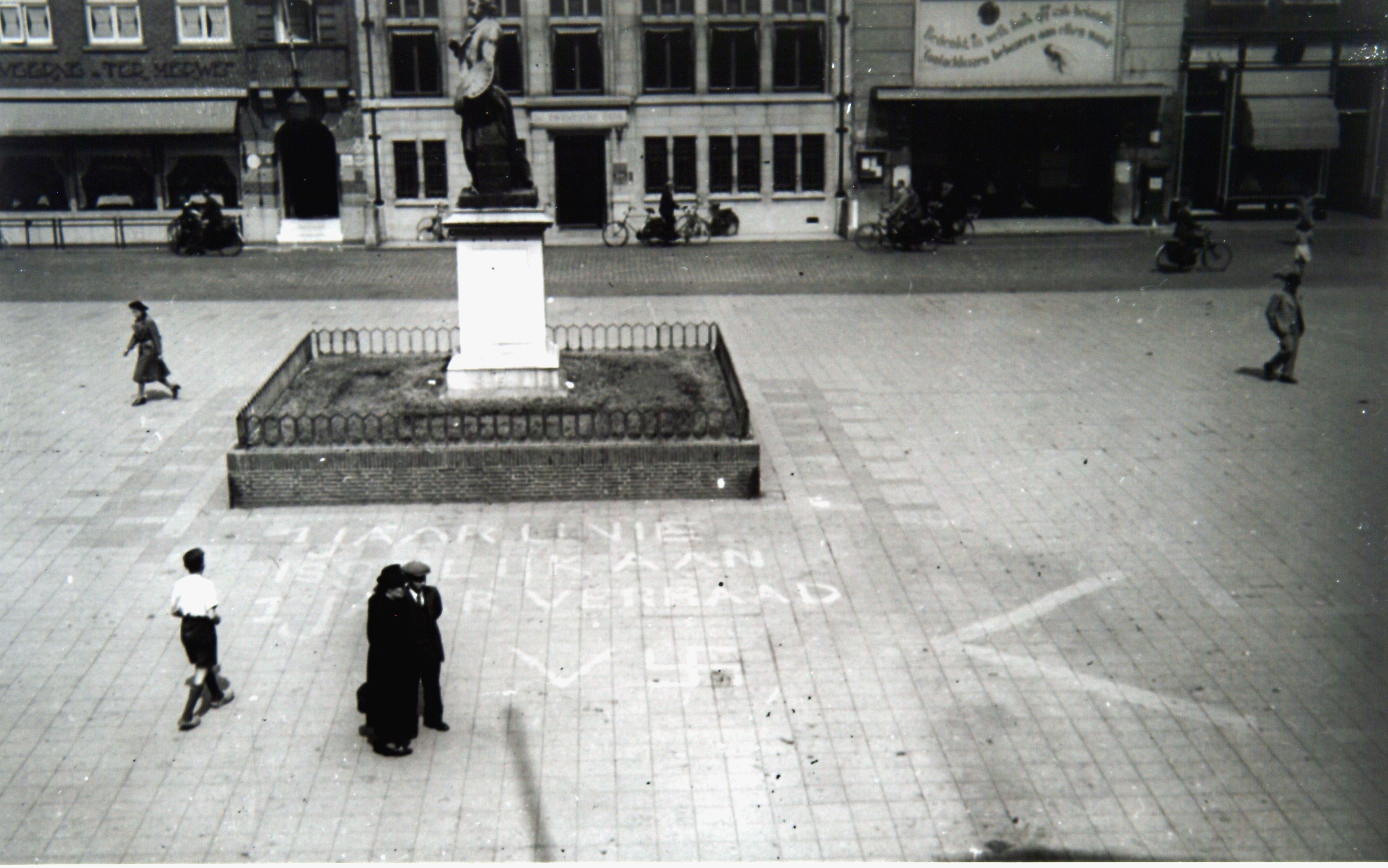 Gekalkte leuzen op het Scheffersplein bij het standbeeld van Ary Scheffer tijdens de bezetting. Op de achtergrond Taveerne Ter Merwe, de Twentsche Bank, het Waaggebouw en apotheek Kluit en Van der Ven.