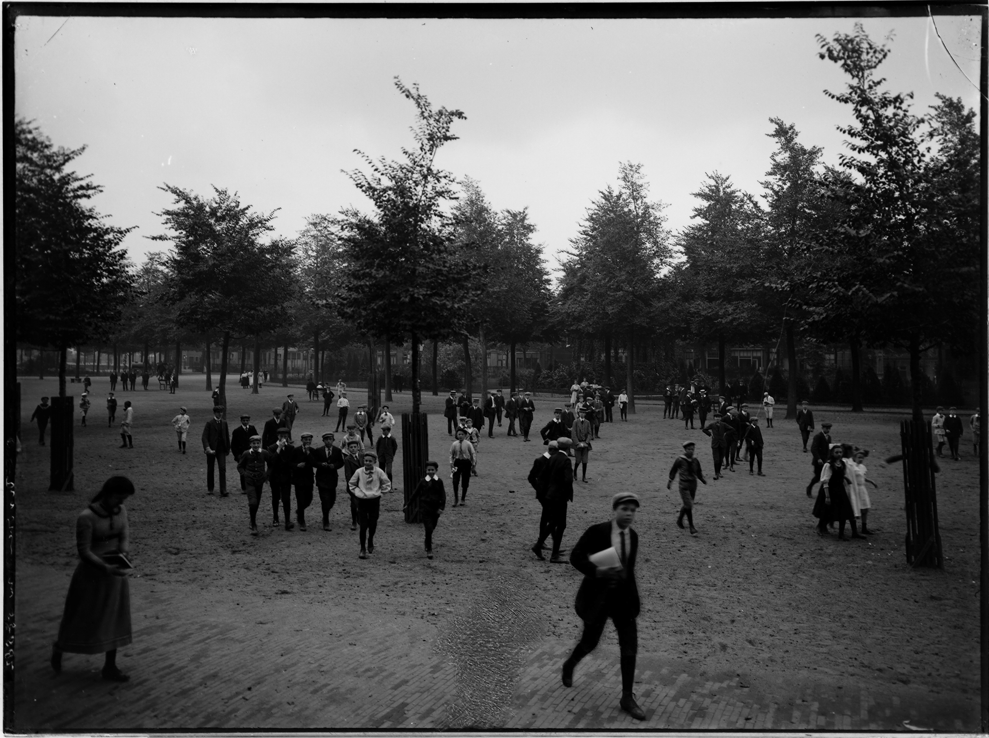 Oranjepark met leerlingen van de HBS; op de achtergrond huizen aan de Toulonselaan; …