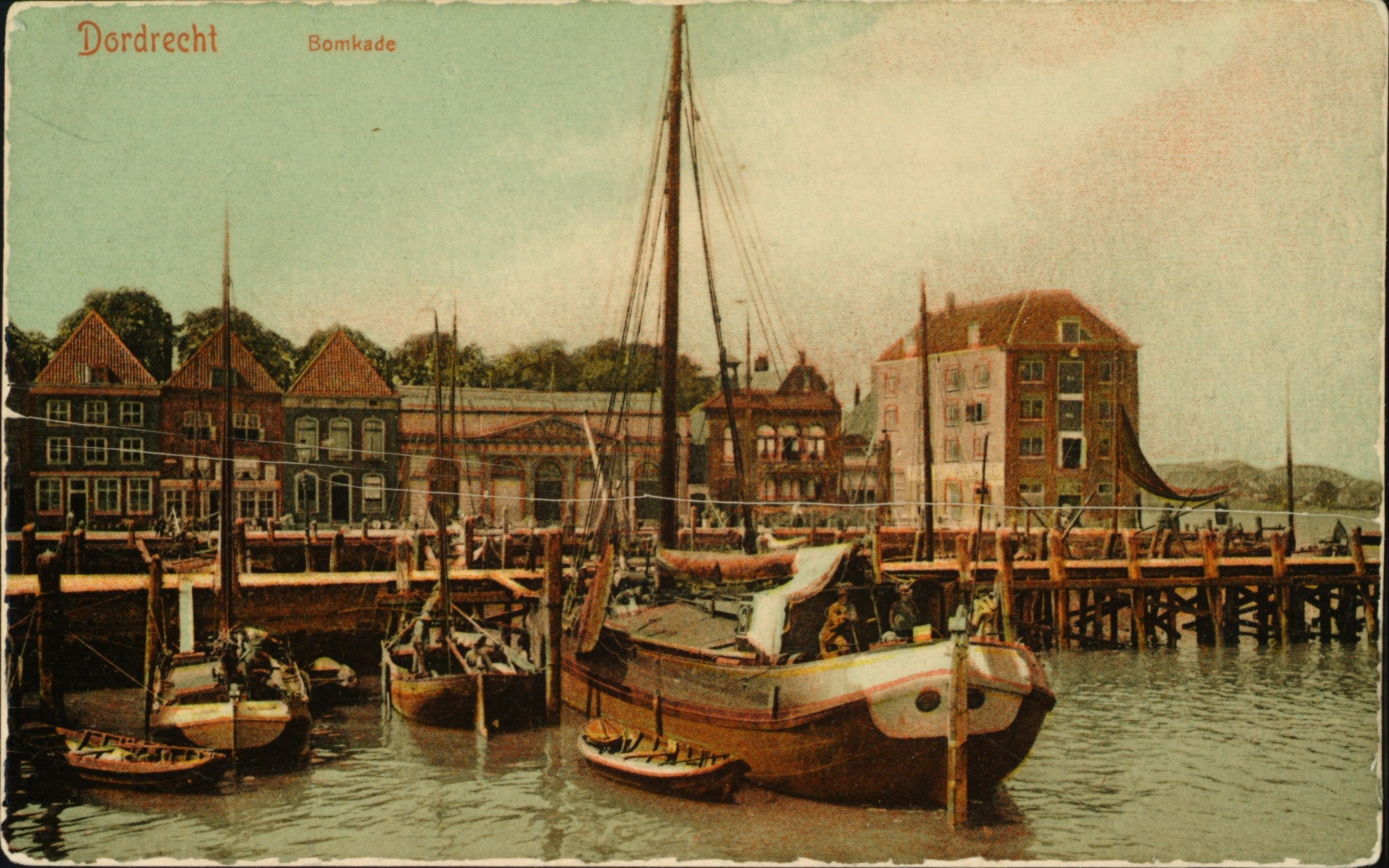 - Over de Leuvehaven zicht op de Bomkade met de Korenbeurs (midden) en pakhuis Vredenburg op de hoek van de Buiten Kalkhaven..