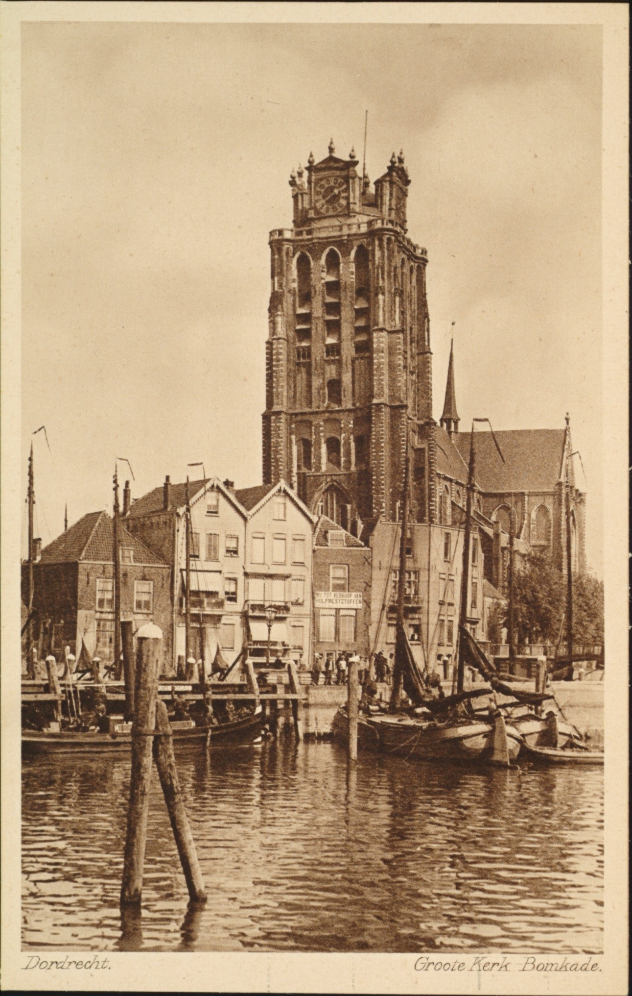 - De Grote Kerk en de achterkant van huizen aan de Korte Geldersekade, gezien over de Bomhaven.