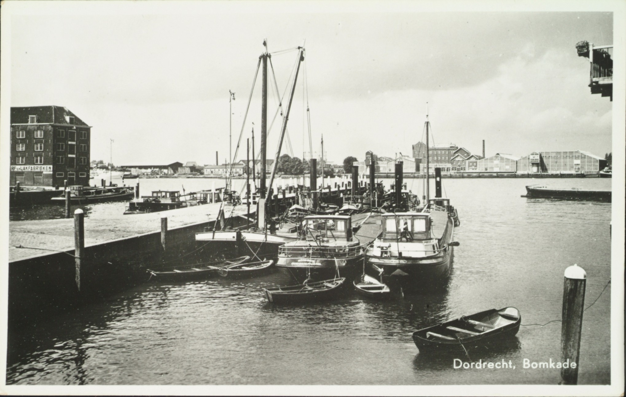 - De Bomhaven. Links pakhuis Vredenburg op de hoek van de Bomkade en de Buiten Kalkhaven.