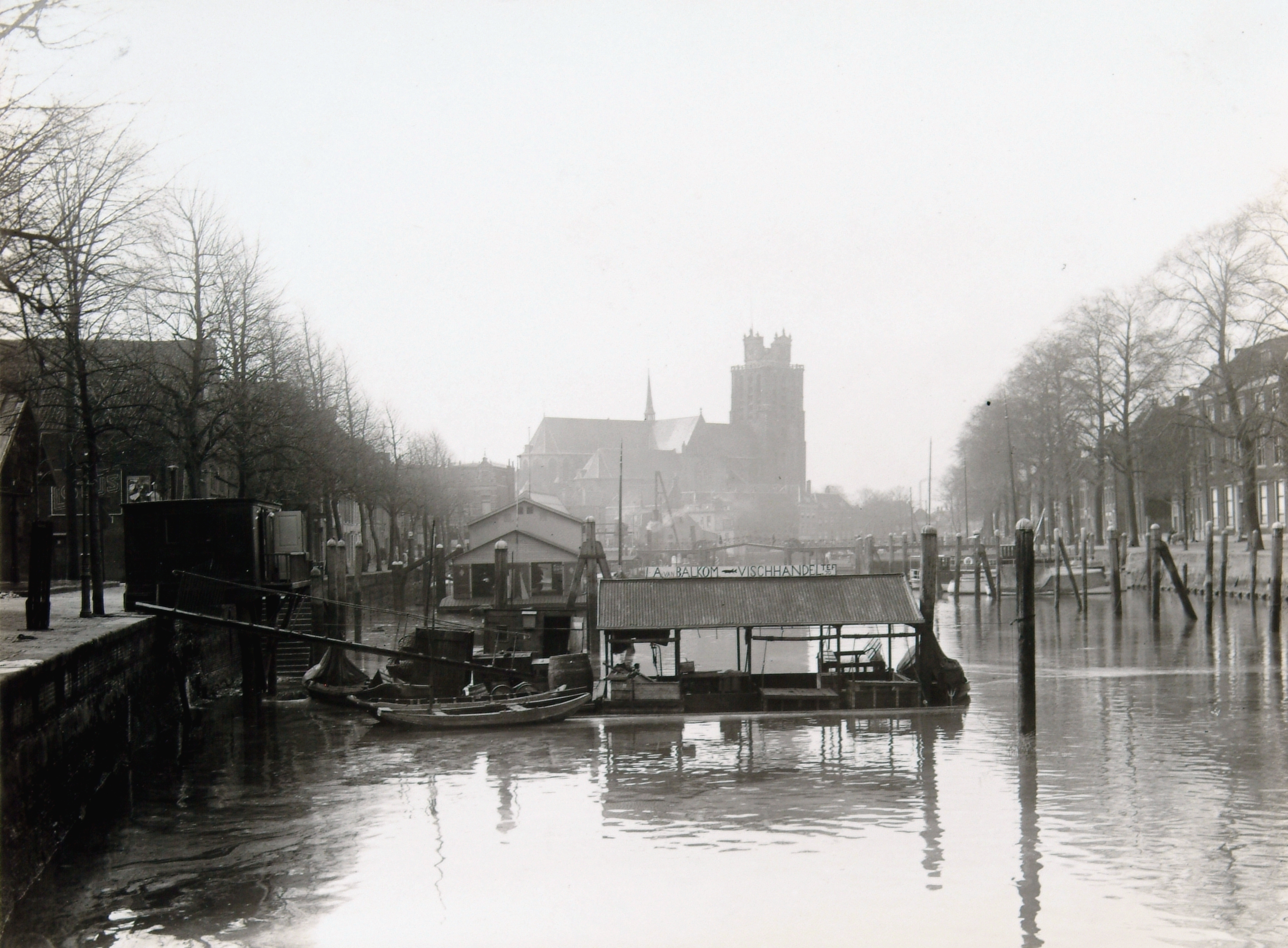 - Visvlot van Van Balkom aan de Knolhaven gezien vanaf de Aardappelmarkt. Achter het visvlot ligt het botenhuis van de K.D.R.en Z. Het huisje dat bij de loopplank gedeeltelijk over het water is gebouwd, werd in 1932 afgebroken.