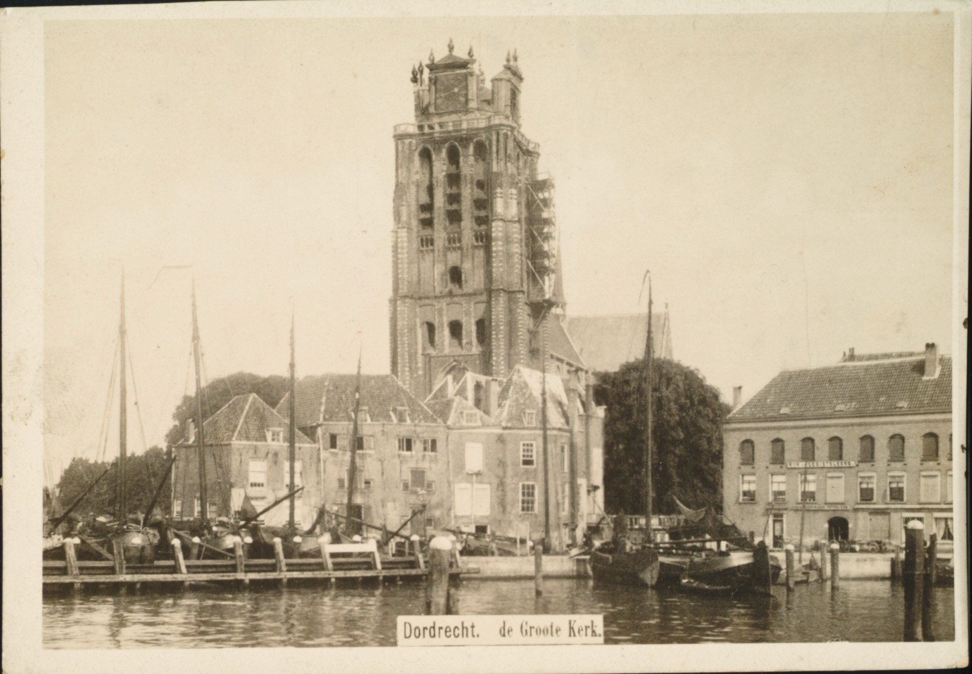 - De Grote Kerk en de achterkant van huizen aan de Korte Geldersekade (links), gezien over de Bomhaven. Bebouwing rechts staat aan de Bomkade.