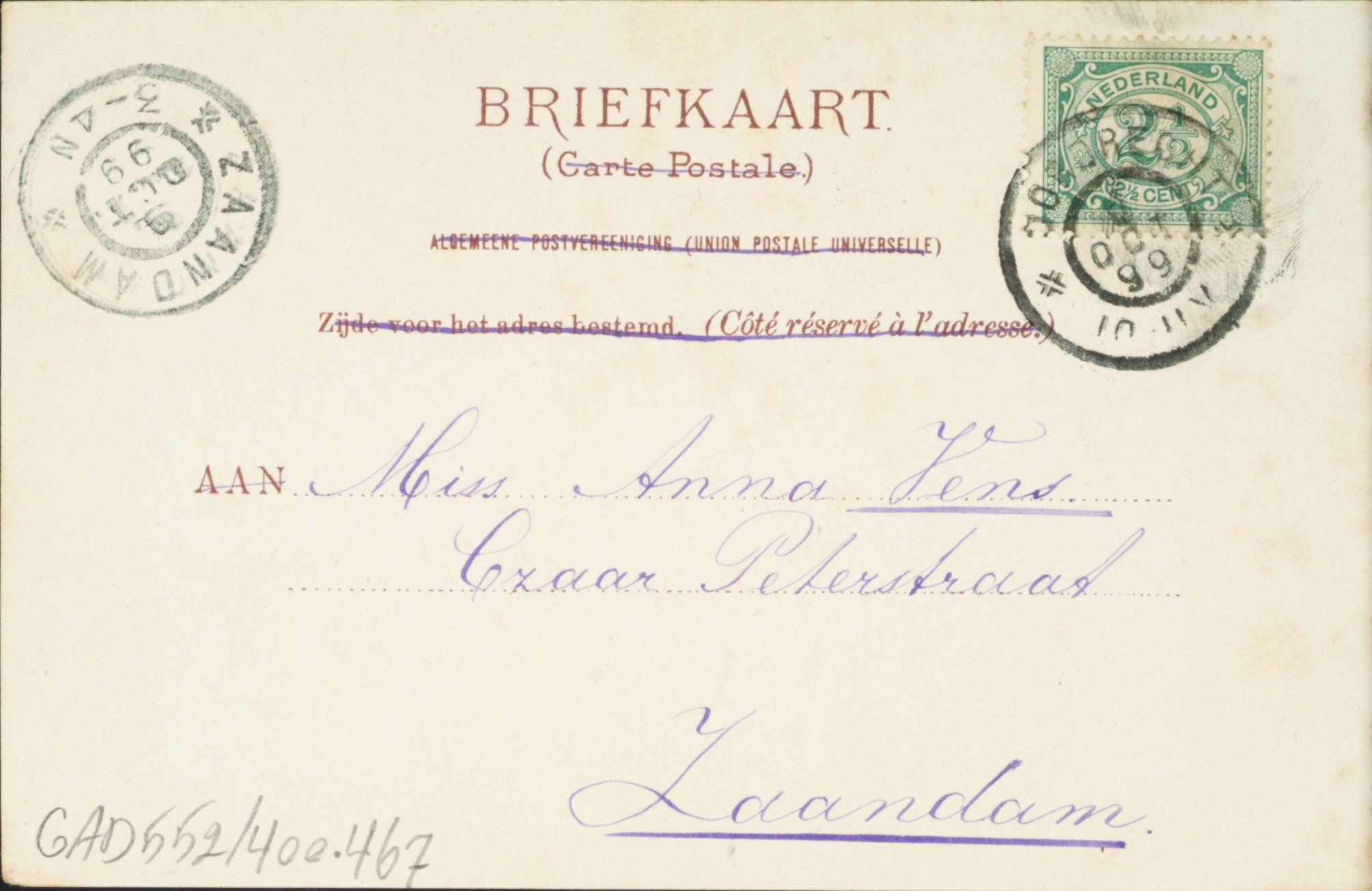 Op de voorzijde een foto van de Bomkade met een stuk Engelse tekst van 9 oktober 1899