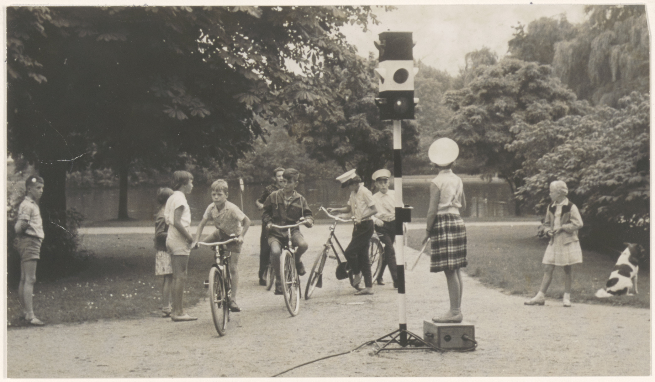 Kruispunt met stoplicht in de op 24 augustus 1960 geopende, 2 km lange jeugdverkeersbaan in het Wantijpark; verkeersbrigadiertjes slingeren overtredertjes onverbiddelijk op de bon.