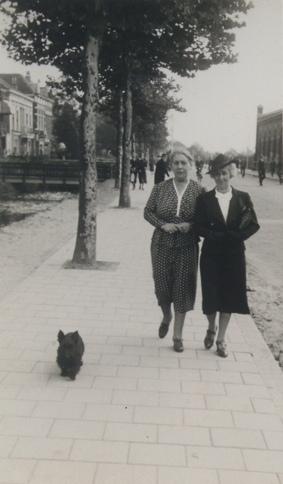 - Twee dames en een hondje op de Burgemeester de Raadtsingel. Links H. van Ameringen, verloskundige, geboren 1886 te Amsterdam, overleden 17 september 1943 te Auschwitz.