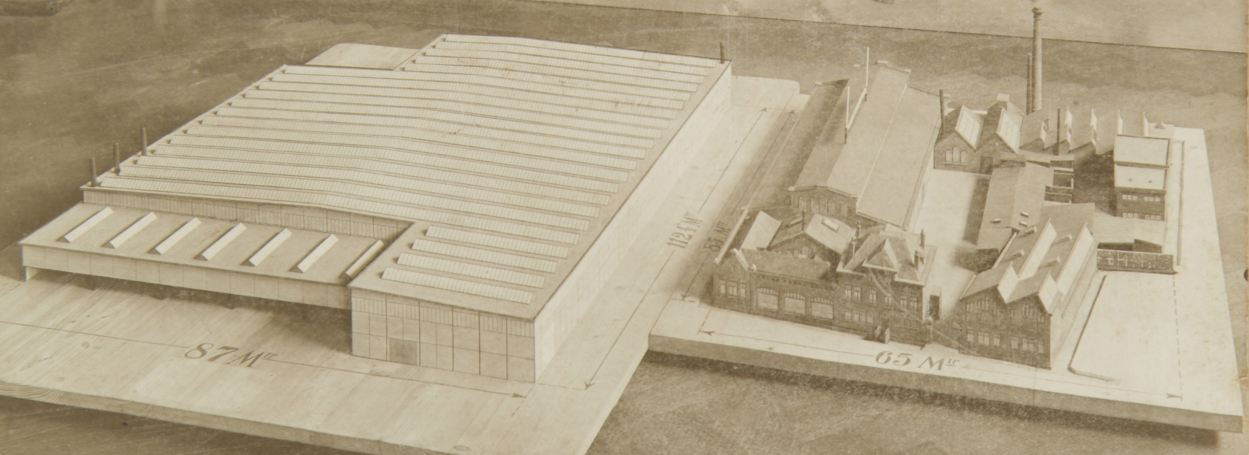 Vergelijking van 2 maquettes van de brandkastenfabriek van Lips: rechts de oude fabriek …