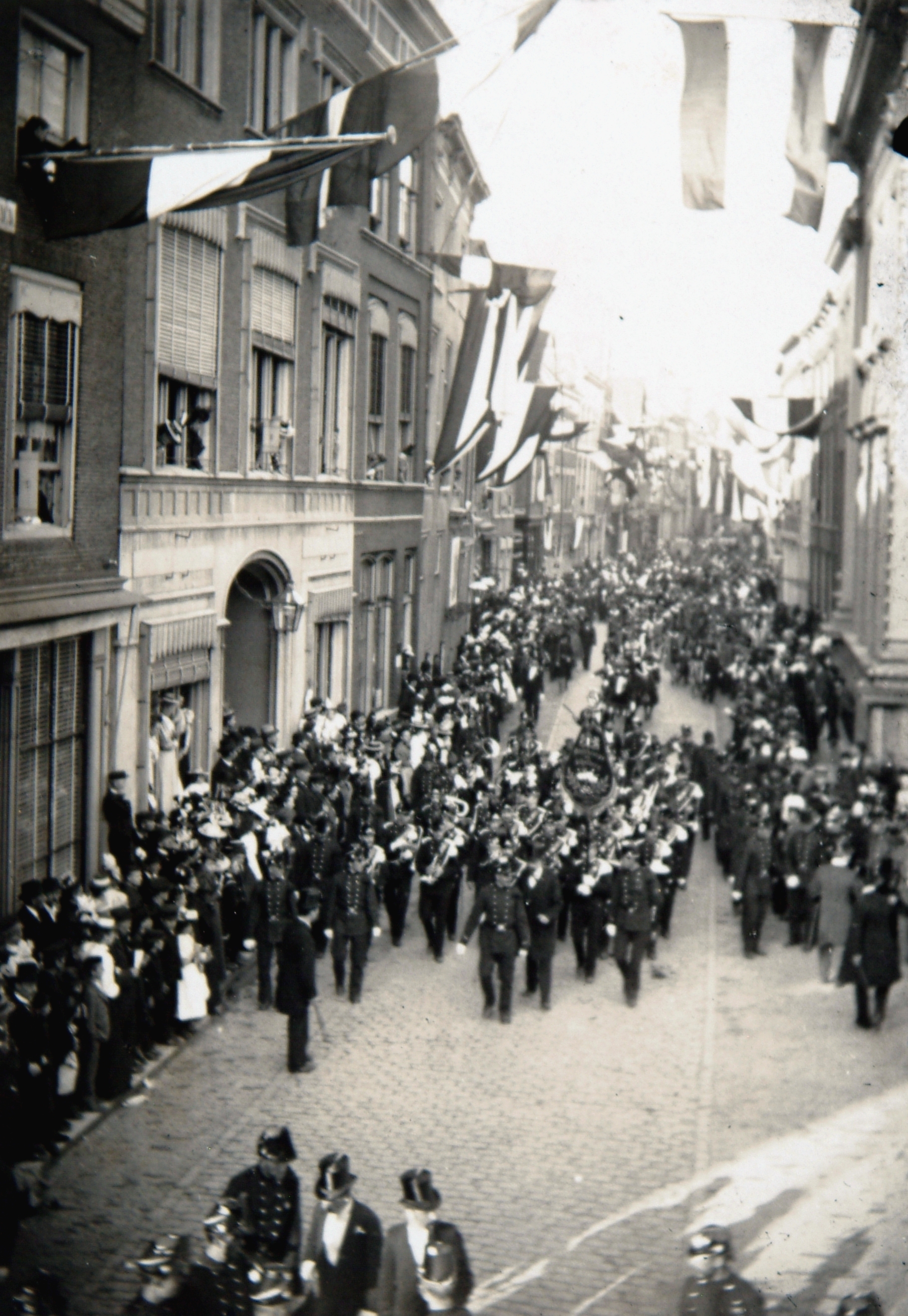 - Muziekkorpsen marcheren over de Groenmarkt vanaf de Wijnstraat