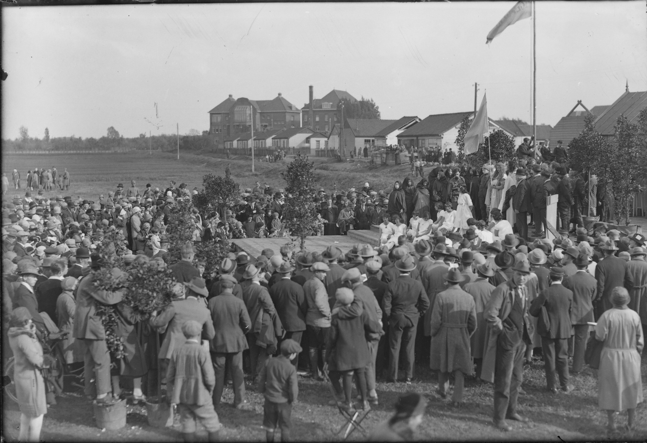 - Openluchtvoorstelling door geheelonthouders bij de noodwoningen bij de Bankastraat. het gebouw rechts is het Gemeente Ziekenhuis