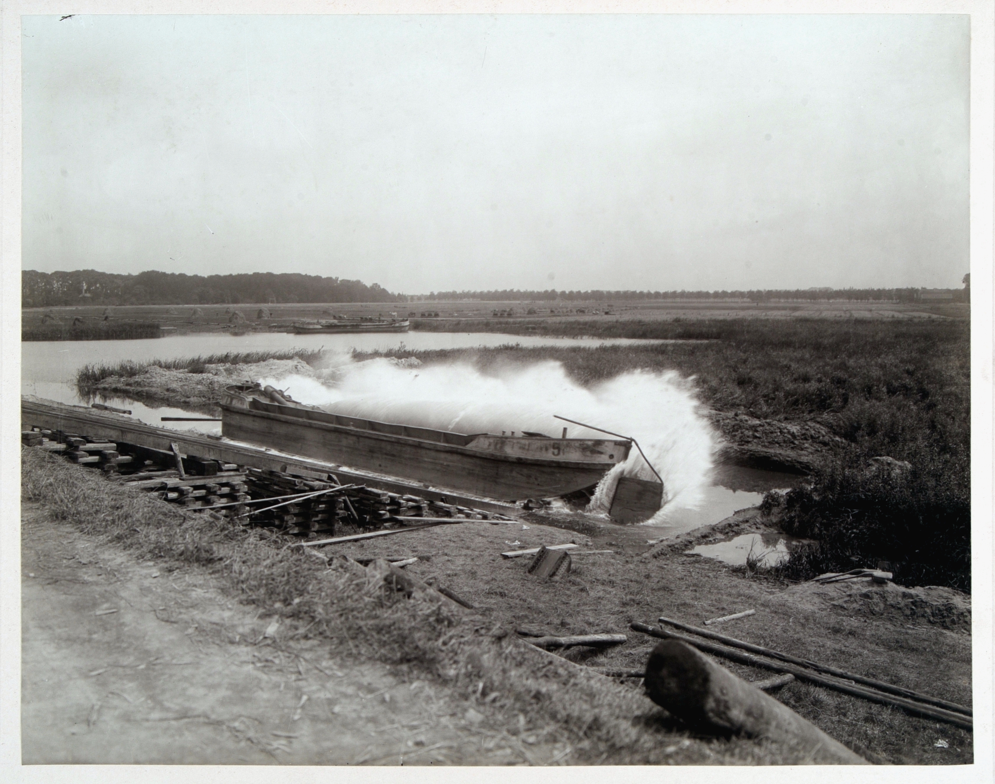 Overbrenging baggerschip langs de glijhelling bij de aanleg van de Wilhelminahaven