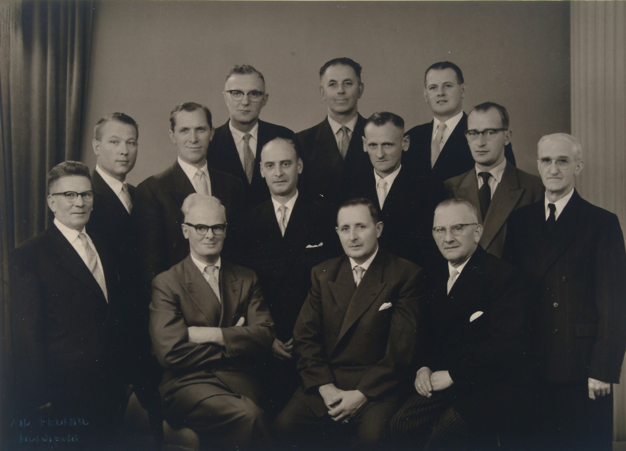 - Groepsportret van bestuur en feestcommissie van de afdeling Dordrecht van de Bond van Kleinhandelaren in Aardappelen, Groente en Fruit in Nederland.