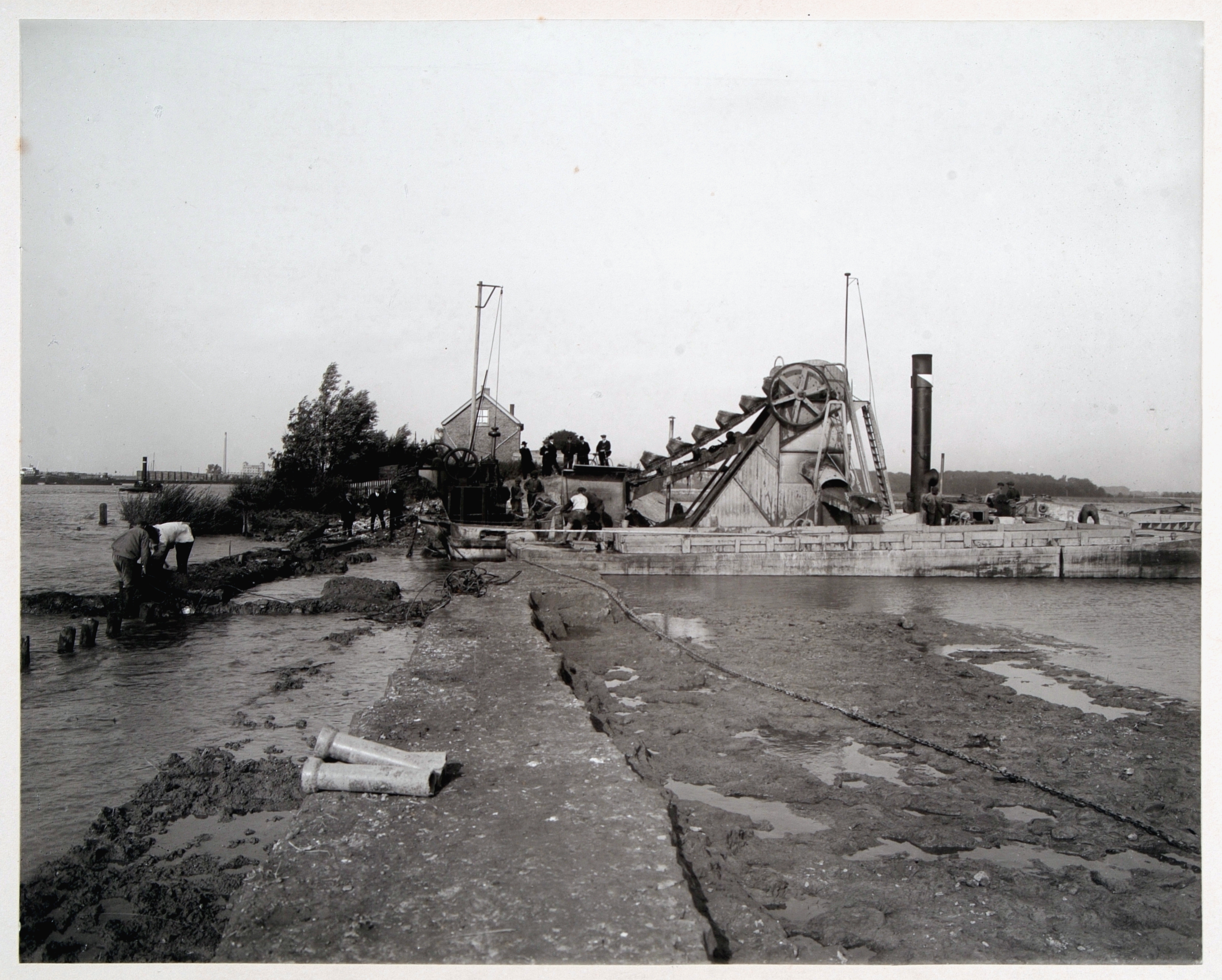 Stoombaggermolen graaft de 's-Gravendeelsedijk door bij de aanleg van de Wilhelminahaven
