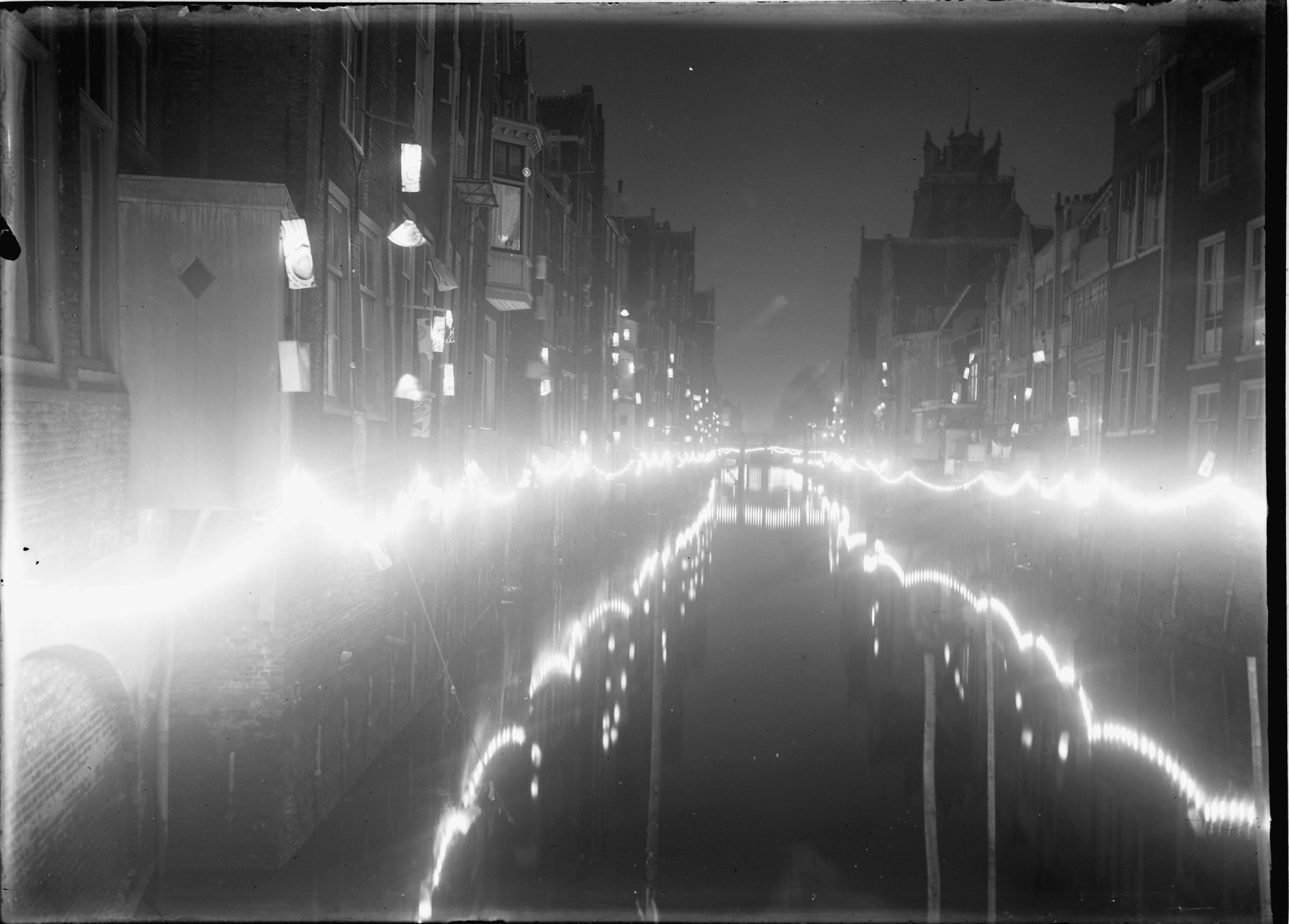 - Verlichte Voorstraatshaven vanaf de Lombardbrug in de richting van de Pelserbrug. Links de achtergevels van panden aan de Voorstraat, rechts de Grotekerksbuurt. Rechts op de achtergrond de Grote Kerk.