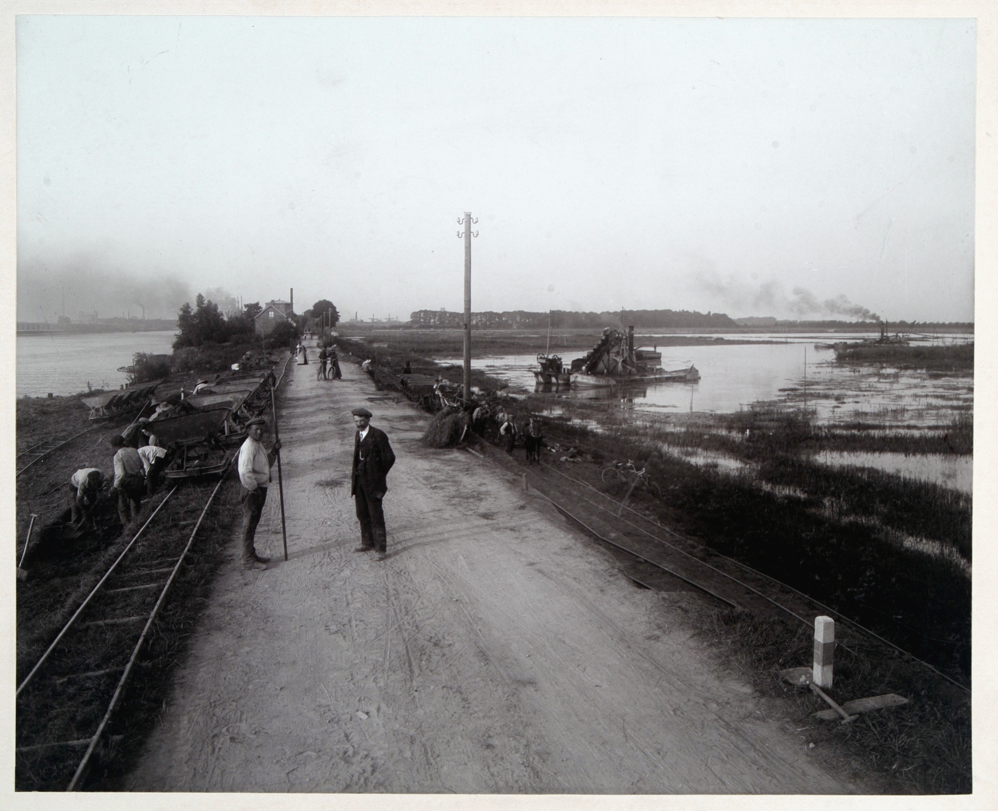 Stoombaggermolen graaft de 's-Gravendeelsedijk door bij de aanleg van de Wilhelminahaven.