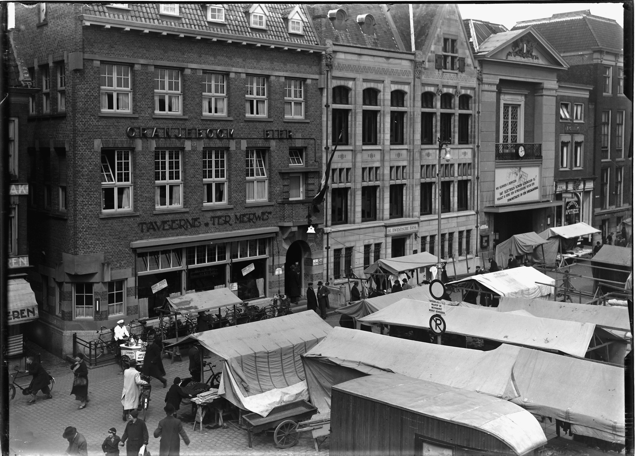 - Marktkramen op de noordwest hoek van het Scheffersplein. Rechts naast restaurant Ter Merwe is de Twentsche Bank, dan het Waaggebouw dat door het G.E.B. werd gebruikt, dan apotheek Kluit en v.d. Ven en tot slot een stukje van de christelijke H.B.S. Links van Ter Merwe is de Tolbrugstraat Waterzijde, waar een ijsventer van La Venezia klanten bedient.