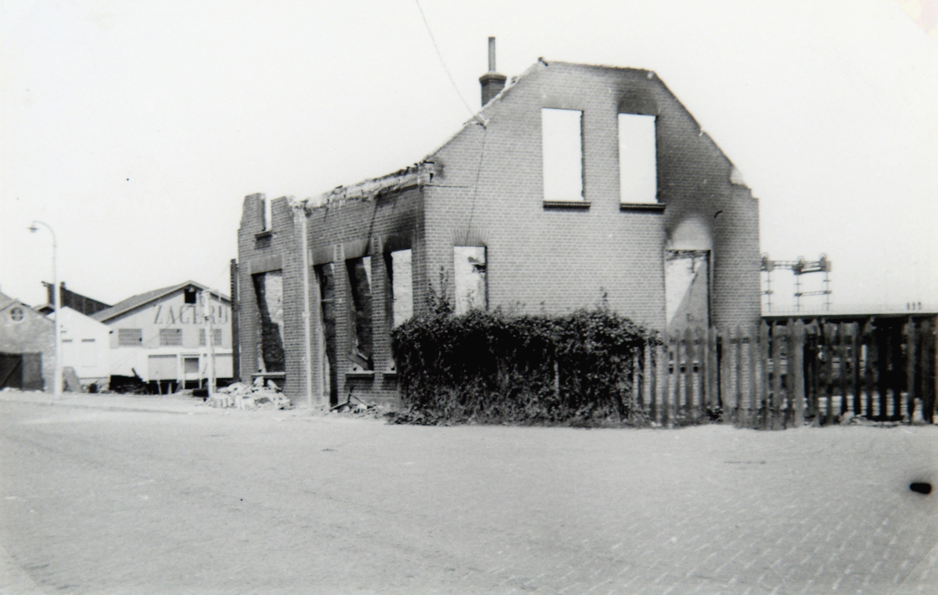 - Door oorlogshandelingen zwaar beschadigde huizen aan de Weeskinderendijk, nummers 69-73. Links de houthandel en zagerij van Berger, rechts van de huizen de Dokbrug.