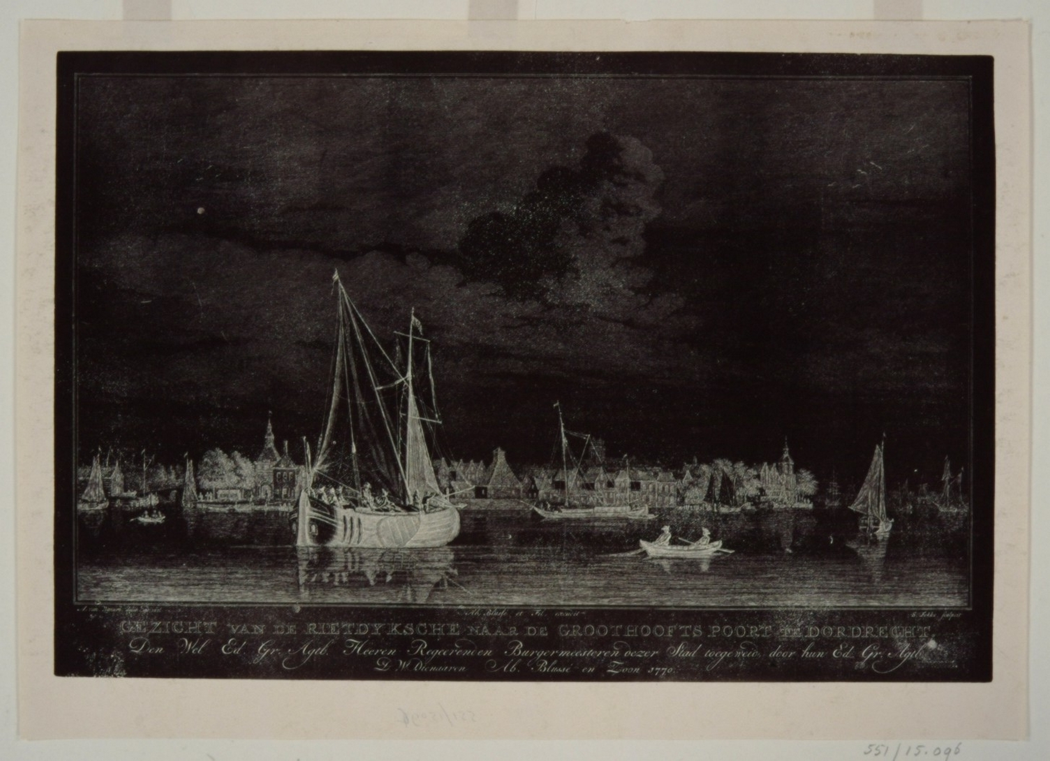 - Moderne afdruk van de gravure door S. Fokke, getekend door A. van Wanum, uitgegeven door A. Blussé en Zoon 1770 met opdracht aan de regerend burgemeesters van Dordercht; afmetingen: Hg. 24.8, br. 37 c.; pendant van 15.091, zie ook 35.036.
