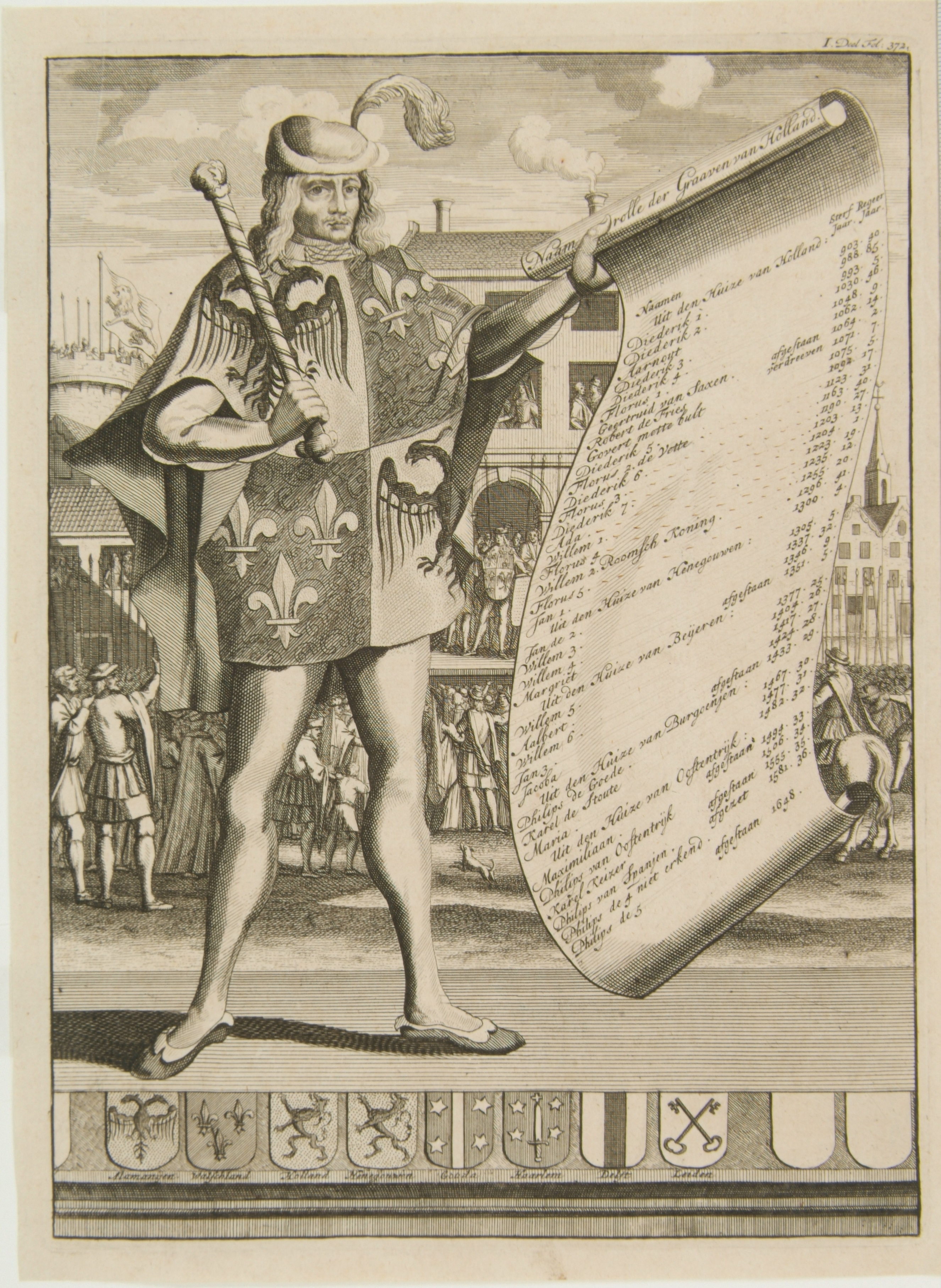 Portret van heraut met bedrukte naamrol