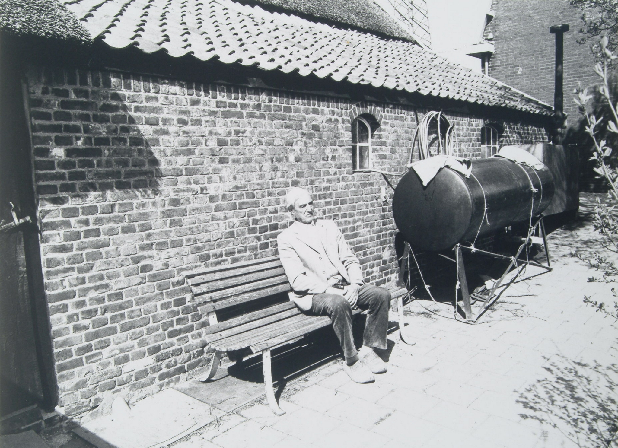 Boer J. van Ham op ca 92-jarige leeftijd op een bank achter zijn boerderij aan de …