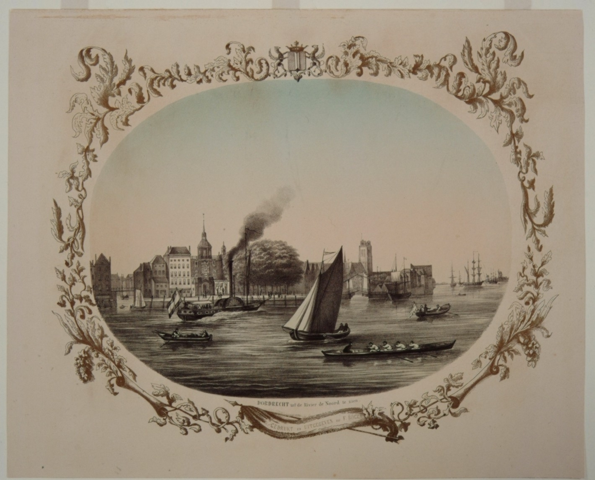 Behoort tot een stel van vier gezichten op Dordrecht van de rivierzijde in ovaal met vergulde randen waarin het wapen van Dordrecht; getekend door J. H. van der Heyden, gedrukt en uitgegegeven door F. Böger, c. 1858; elke plaat hg. ± 36 br. 36 c.