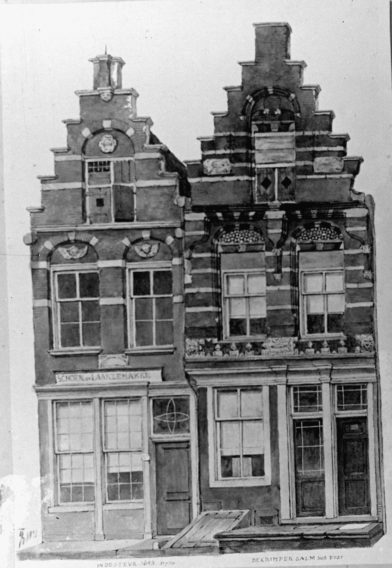 Tekening van trapgevels van de panden 'In de Steur' en 'De Crimpert Salm' in de Visstraat.