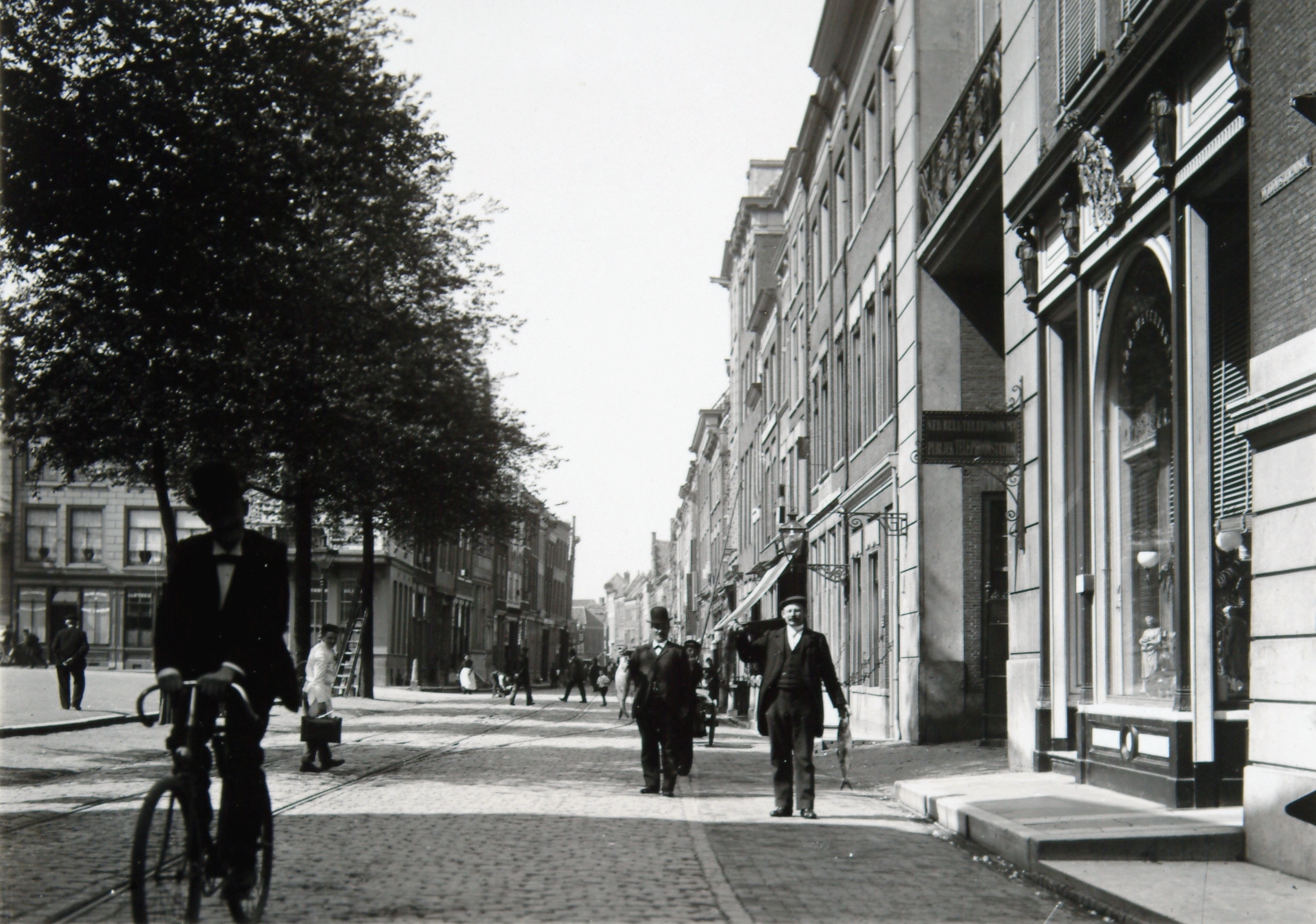 - De Wijnstraat langs het Scheffersplein, naar Groenmarkt gezien. Tweede gebouw van rechts (inspringend) is het waaggebouw.