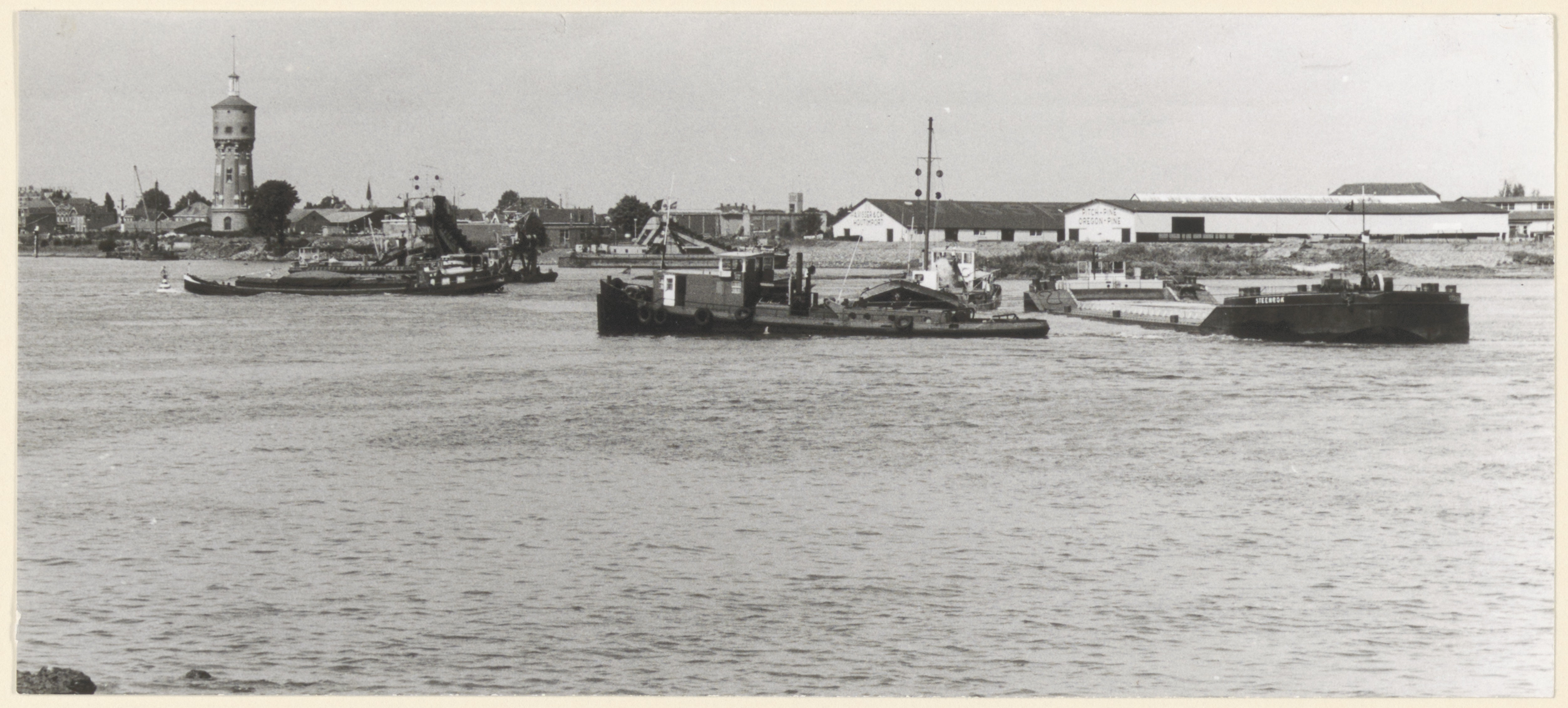 De vastgelopen zandbak Steenbok in de Oude Maas. Op de achtergrond de watertoren in Zwijndrecht, rechts houthandel Visser.