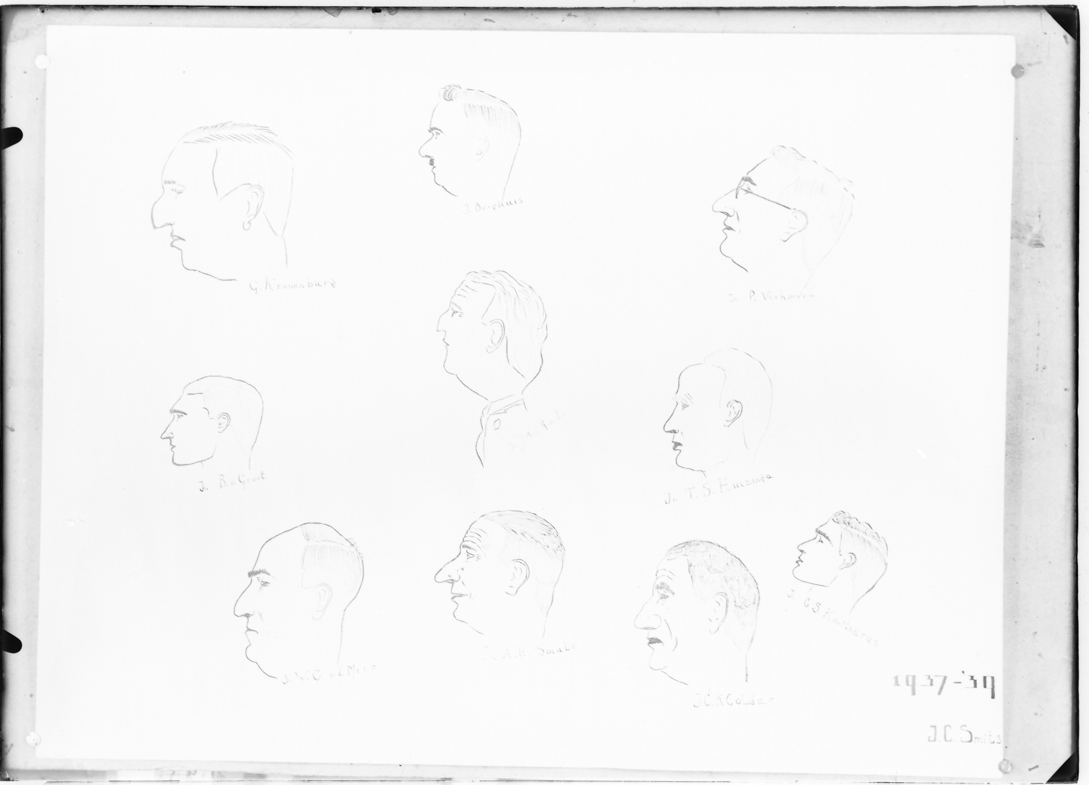 - Getekende portretten van leraren van de Rijkslandbouw winterschool met hun namen eronder. De school zat aan de Oranjelaan