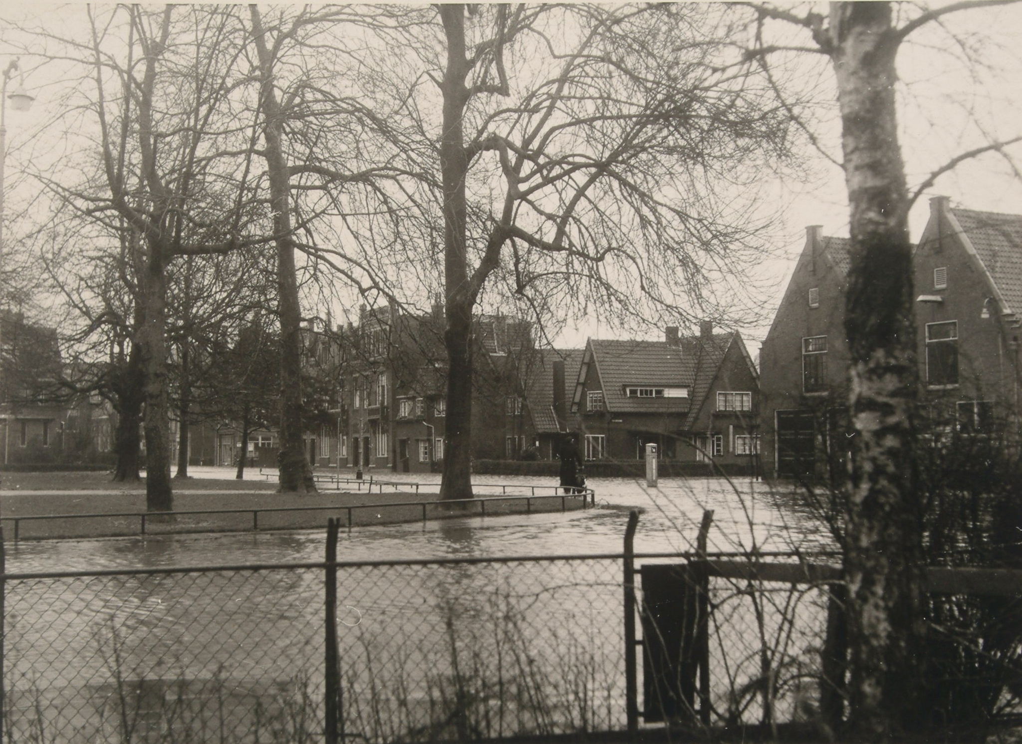 - Overstroming tijdens de watersnoodramp op de Sint Jorisweg (voorgrond) en Godfried Schalckensingel. Rechts van de verkeerszuil is de Hallincqlaan.