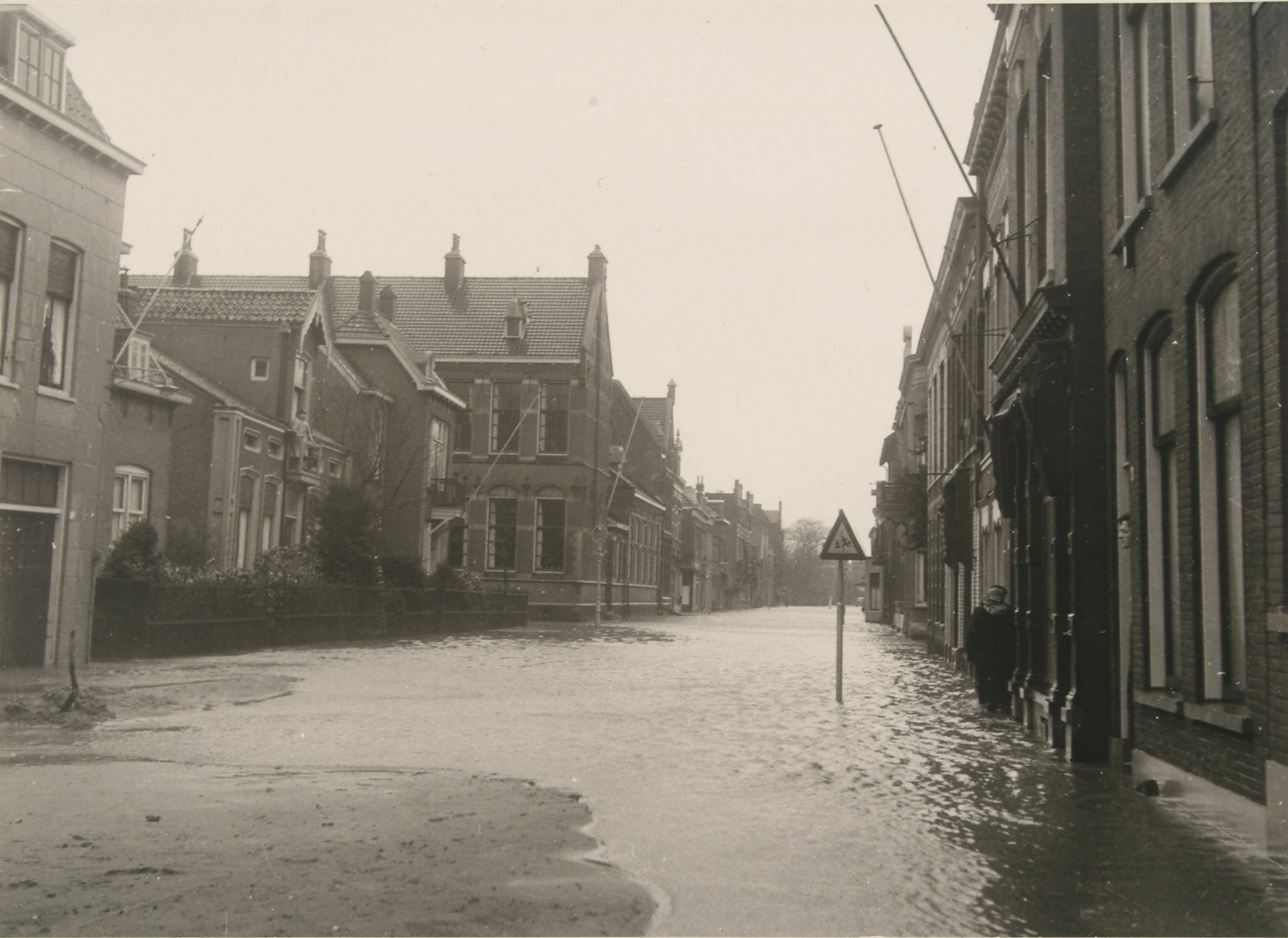 - Overstroming op de Godfried Schalckensingel bij de Steltenstraat vanwege de watersnoodramp, gezien vanaf de Noordendijk