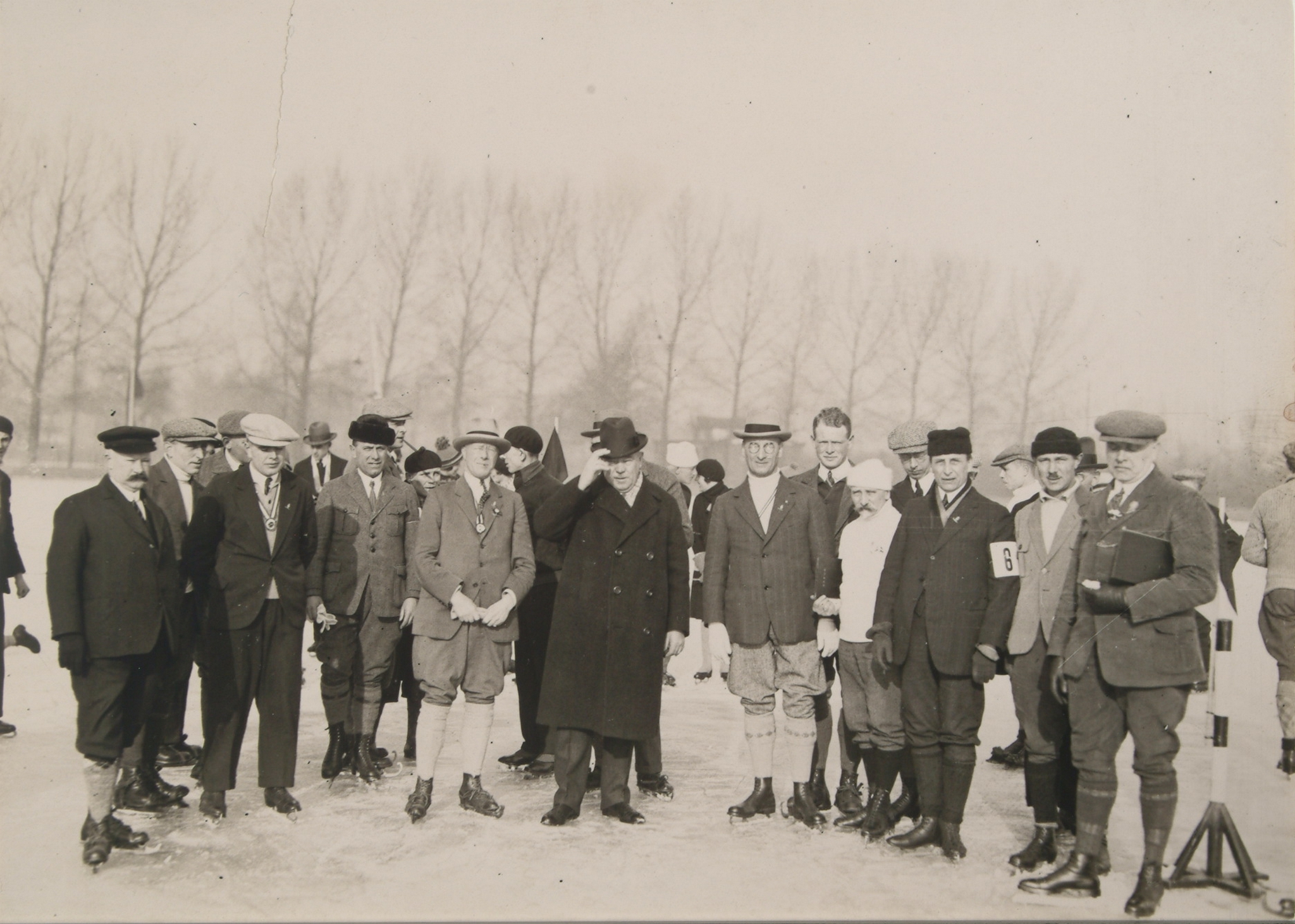 - Schaatsers op de ijsbaan aan de Bankastraat Oranjelaan Kampioenschap schoonrijden voor heren voor de prov. Zuid-Holland; v.l.n.r. H.M. Keppel Hesslink, ?, E. Lautenbach, G.D. Rabots, V. Eras, A. Bos, B.J. Verhey, Freytag, P. Hoebée en ?