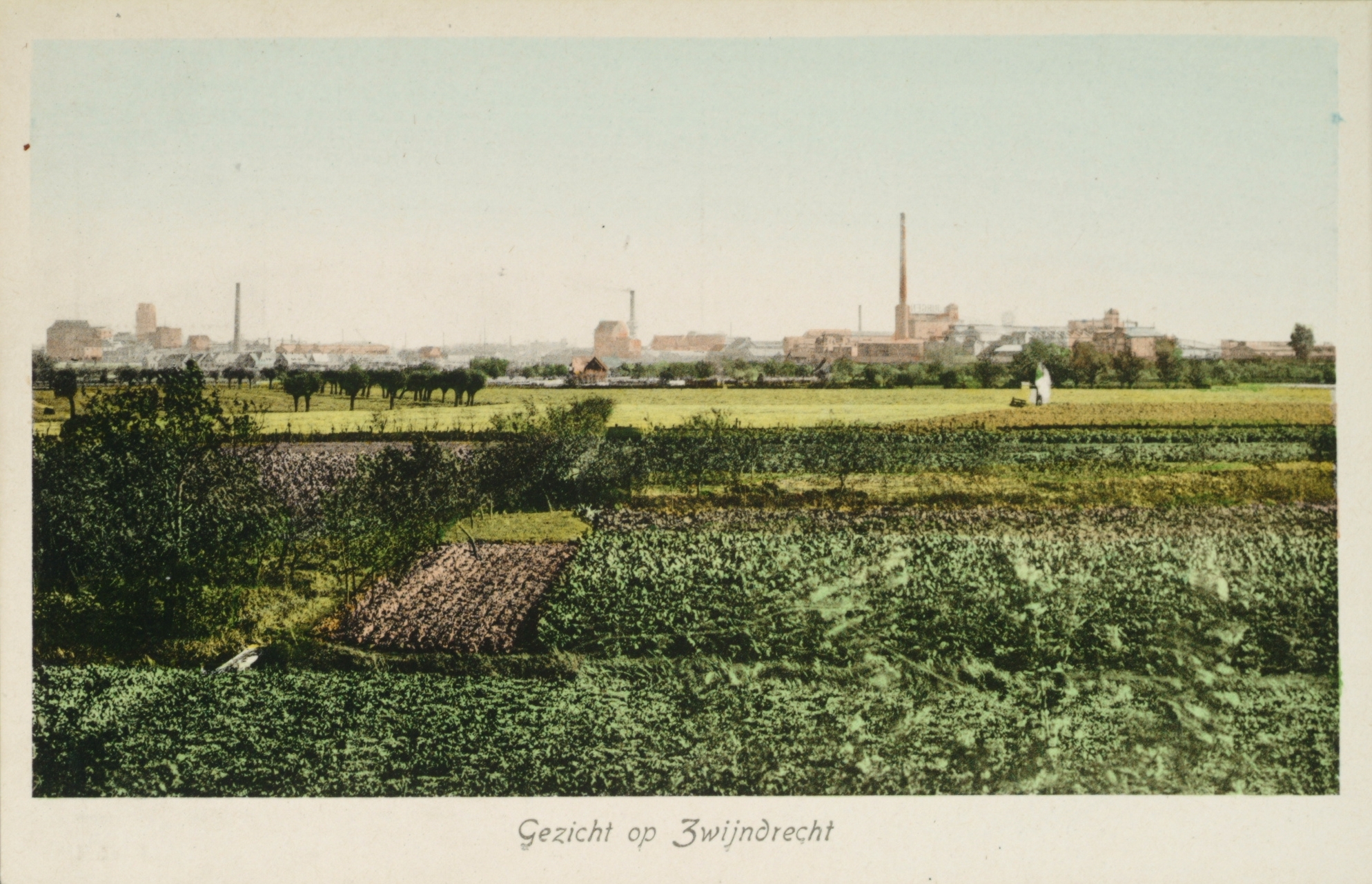 Op het dak van het meest rechtse gebouw bij de hoge schoorsteen staat 'Jurgens' in spiegelbeeld, zie ook 552_300054, en de schoorsteen in het midden heeft de karakteristieke ombouw die ook op 552_405669 te zien is. Dus vanaf het midden naar rechts de gebouwen van de V.O.Z. aan de Lindtsedijk. De spoorbrug (die links voor de Grote kerk langs zou moeten lopen) zie ik niet. Mogelijk weggeretoucheerd voor de briefkaart, of precies achter bebouwing. Standpunt inderdaad waar Ad meldt, op de Lindtsedijk.