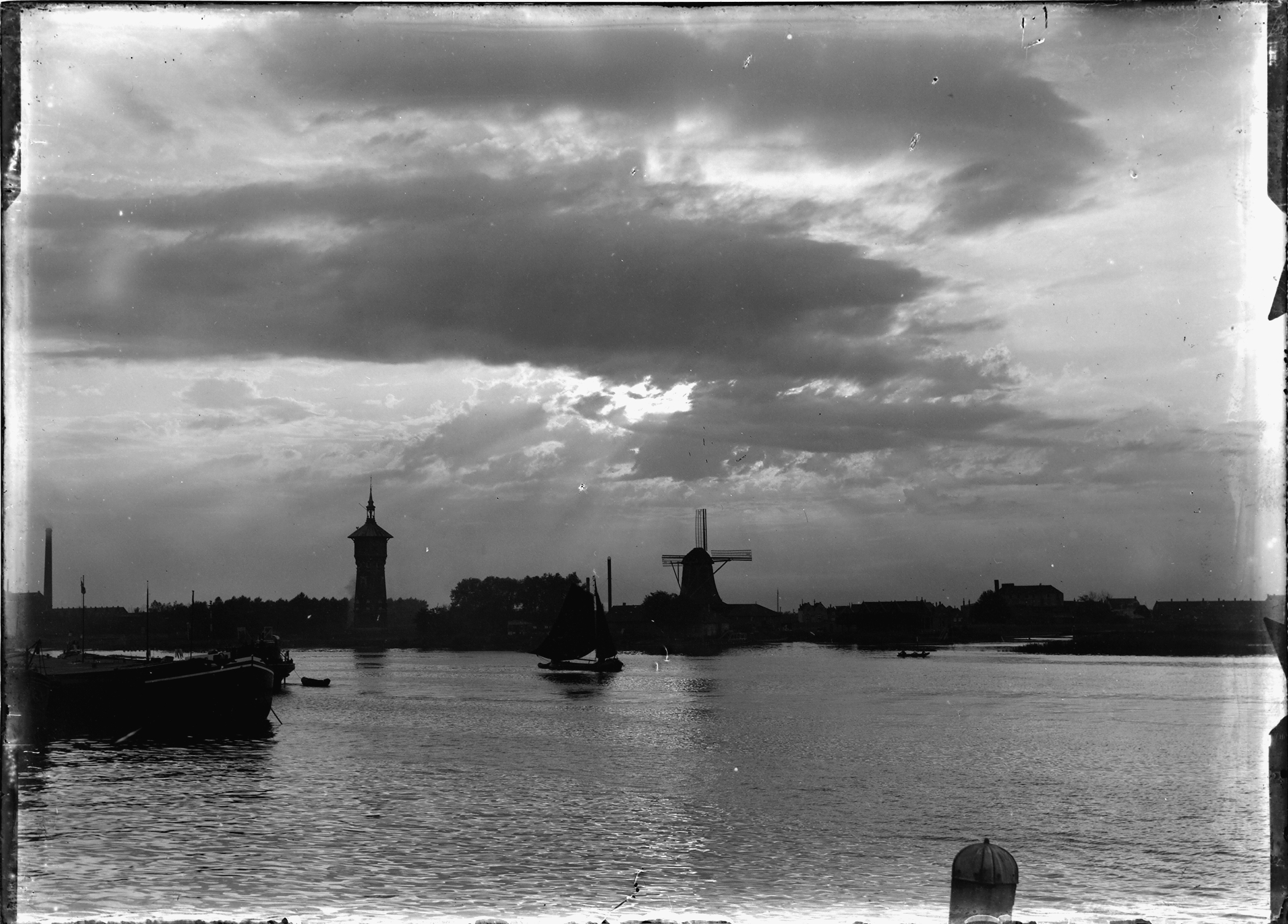 - De Oude Maas ter hoogte van de Wolwevershaven met de watertoren en molen Welgelegen in Zwijndrecht.