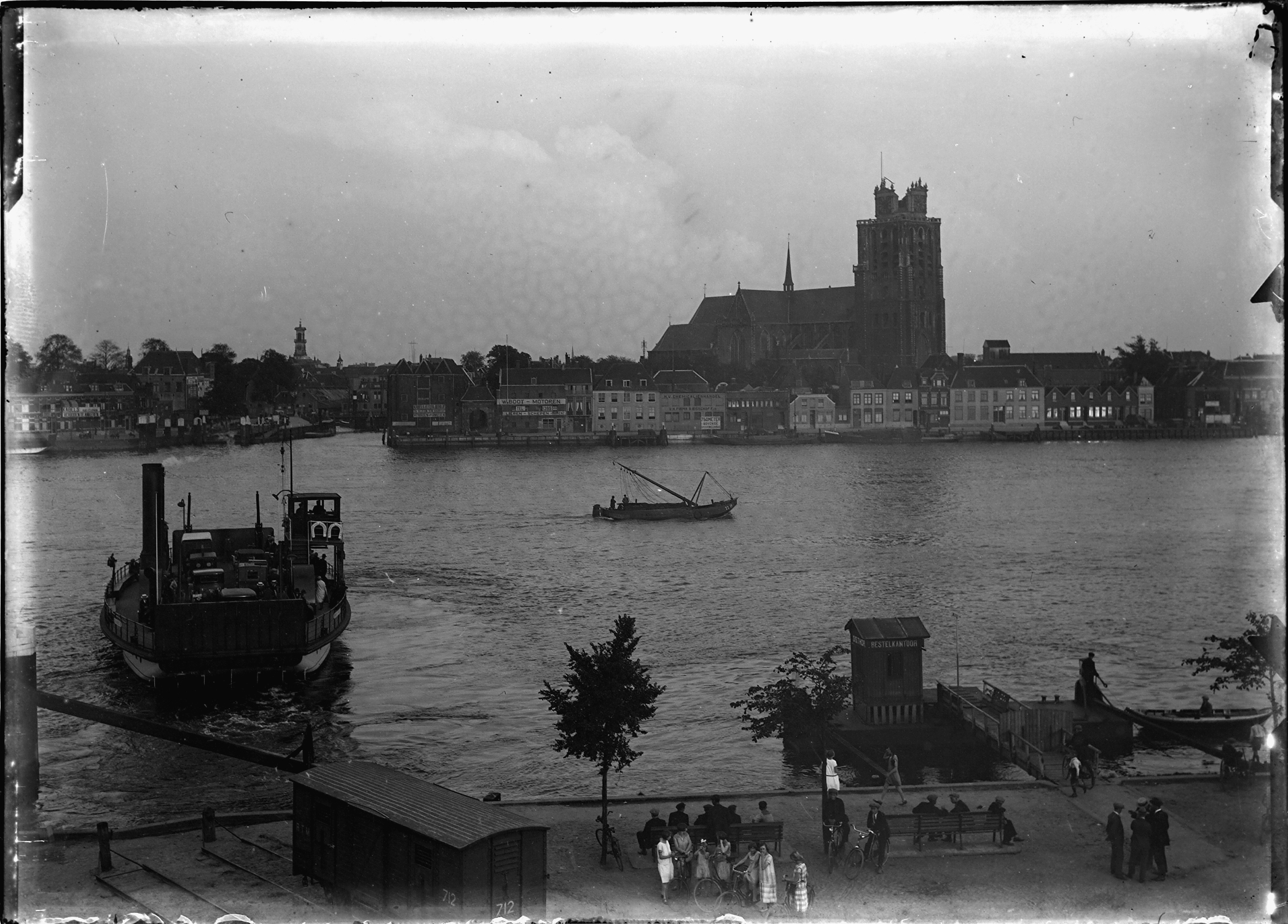 - De Oude Maas vanaf het Veerplein in Zwijndrecht. In Dordrecht ligt links de Buiten Walevest, dan de ingang tot de Nieuwe Haven (de toren van het stadhuis op de achtergrond). Rechts van de haveningang staat pakhuis Rusland, daarnaast de Catrijnepoort aan de Hooikade.