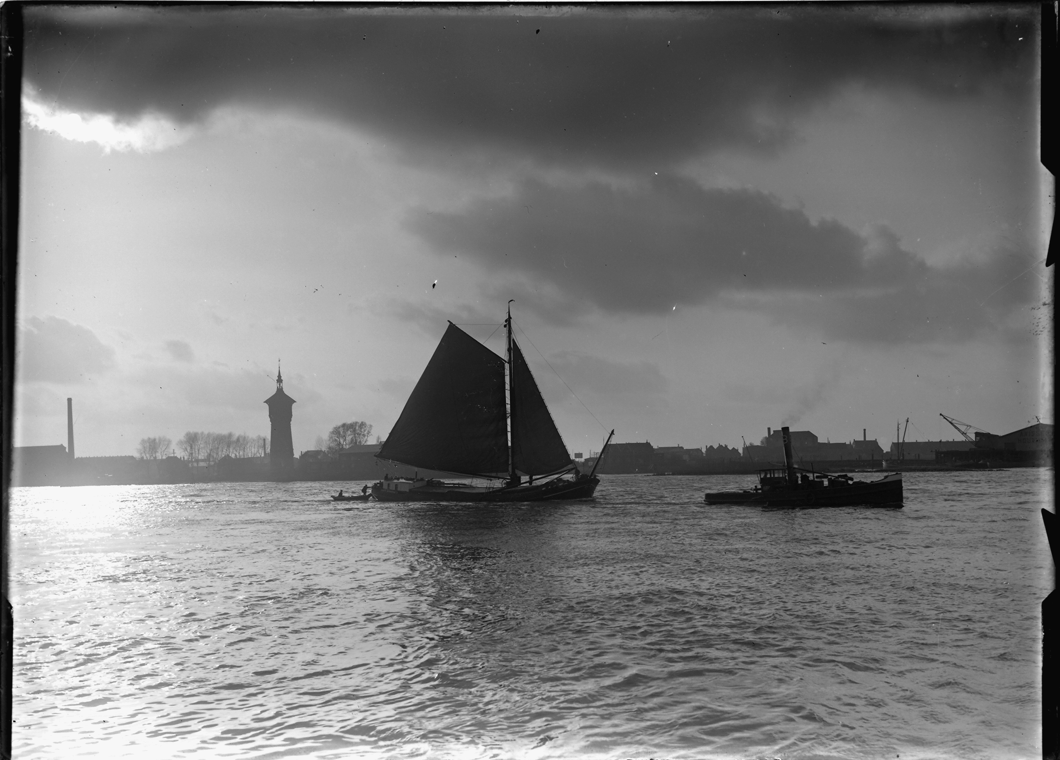 De Oude Maas ter hoogte van de Wolwevershaven. Op de achtergrond de watertoren in …