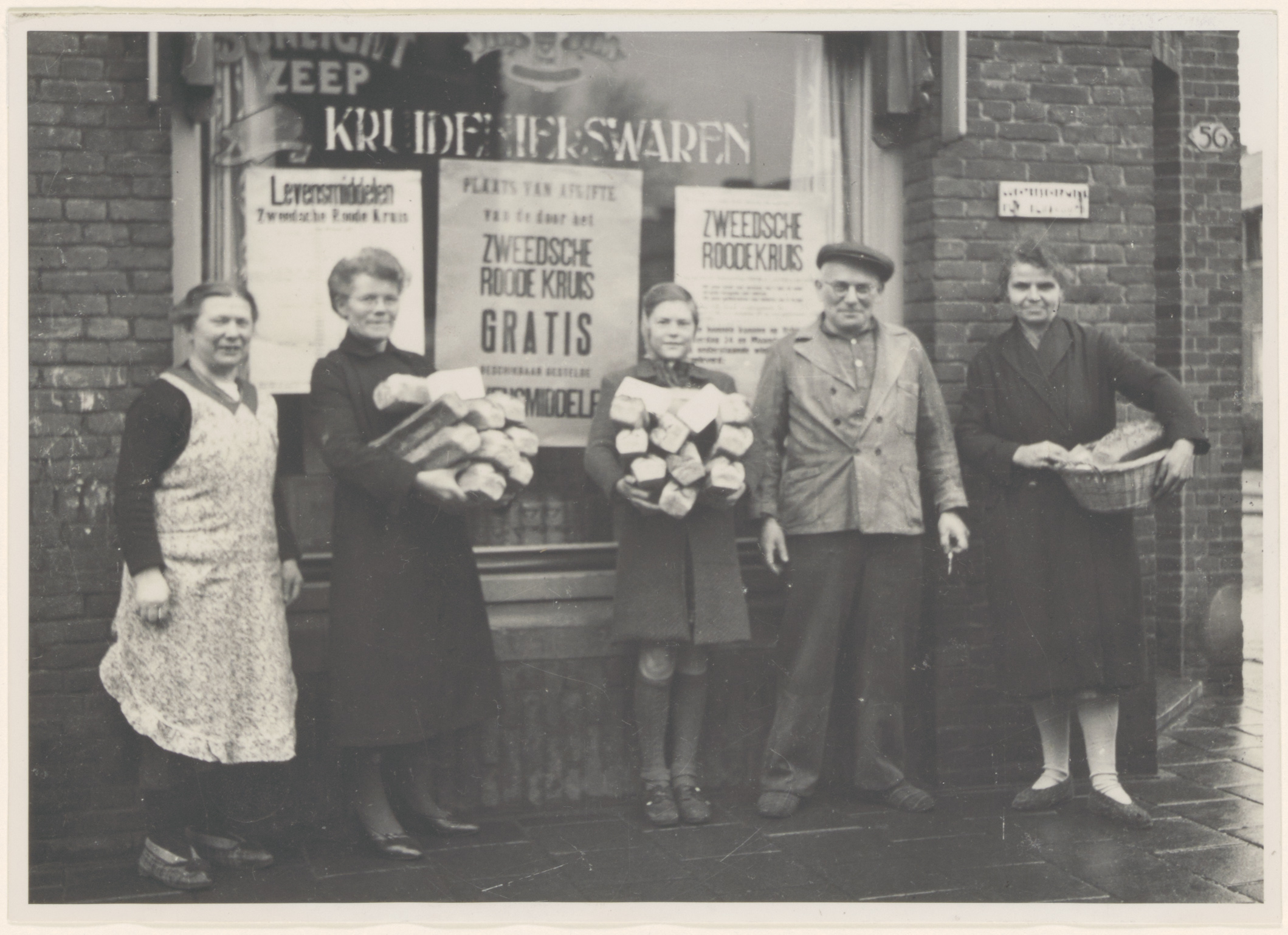 - Uitdeling van Zweedse margarine en Zweeds wittebrood in de kruidenierswinkel van Hartman in de IJsselstraat op de hoek van de Johannes Spaanstraat (rechts).
