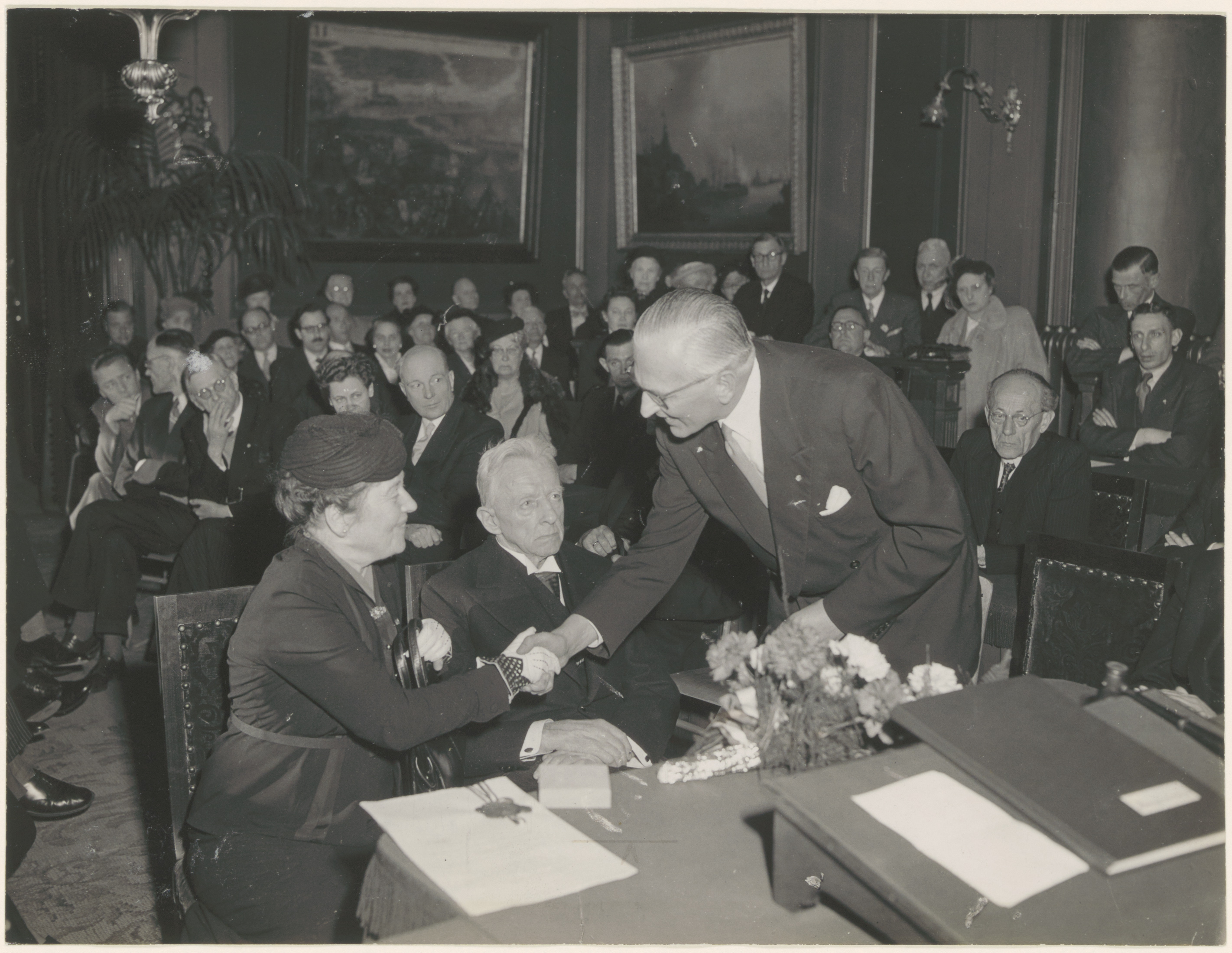 Huldiging op het stadhuis van mevrouw A. van Rhijn - Naeff (Top Naeff) als ereburger …