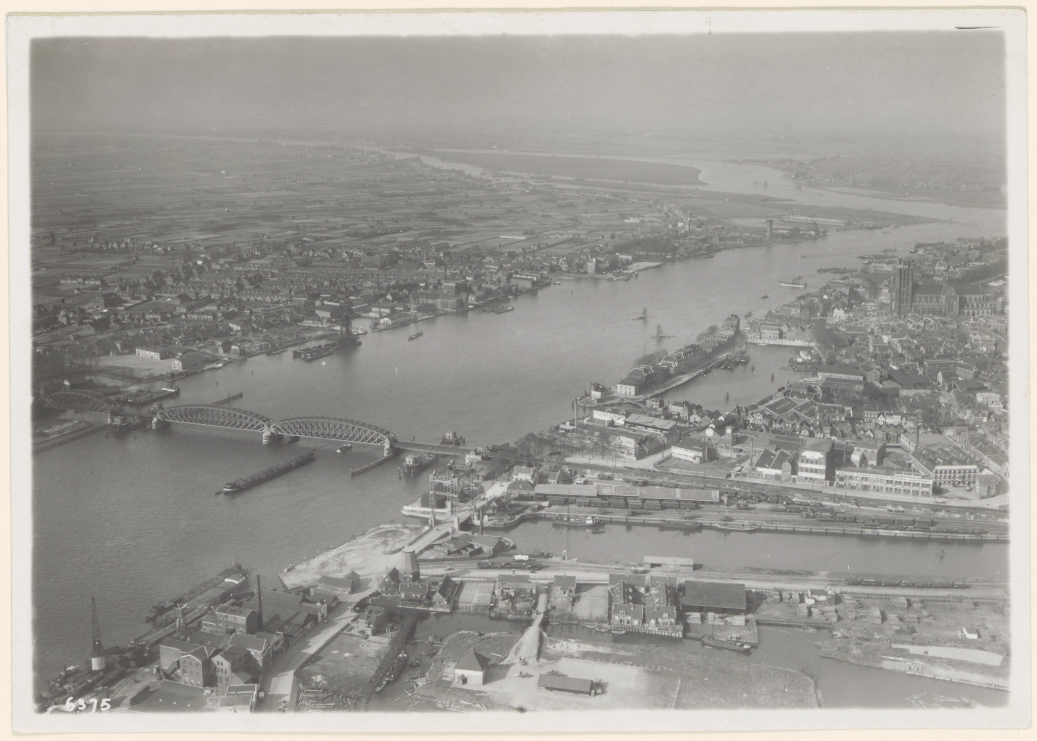 - Luchtfoto in oostelijke richting van Zwijndrecht en Dordrecht (rechts) met de spoorbrug over de Oude Maas.