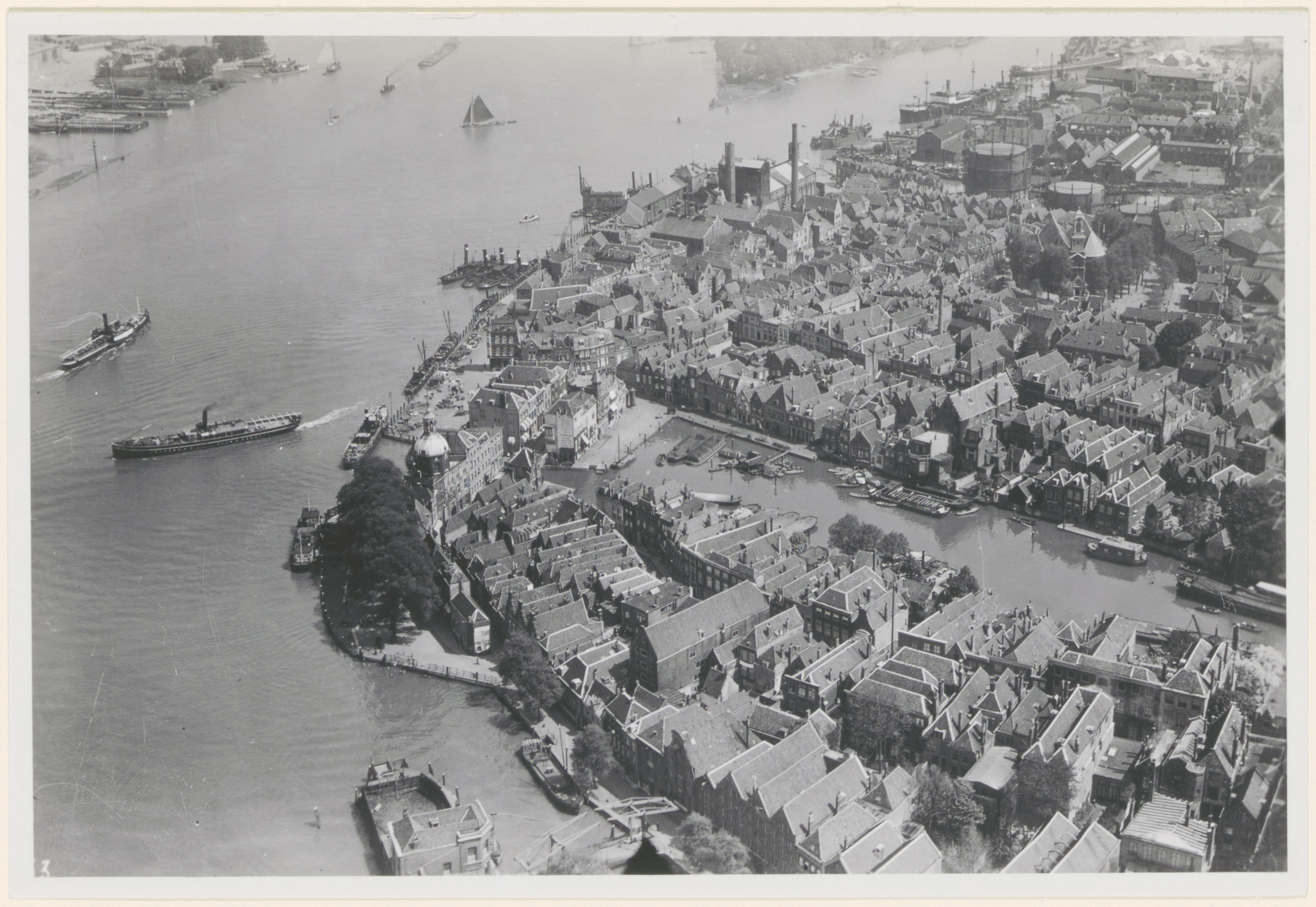 Luchtfoto van het centrum vanaf de Wolwevershaven over de Wijnhaven naar het oosten.