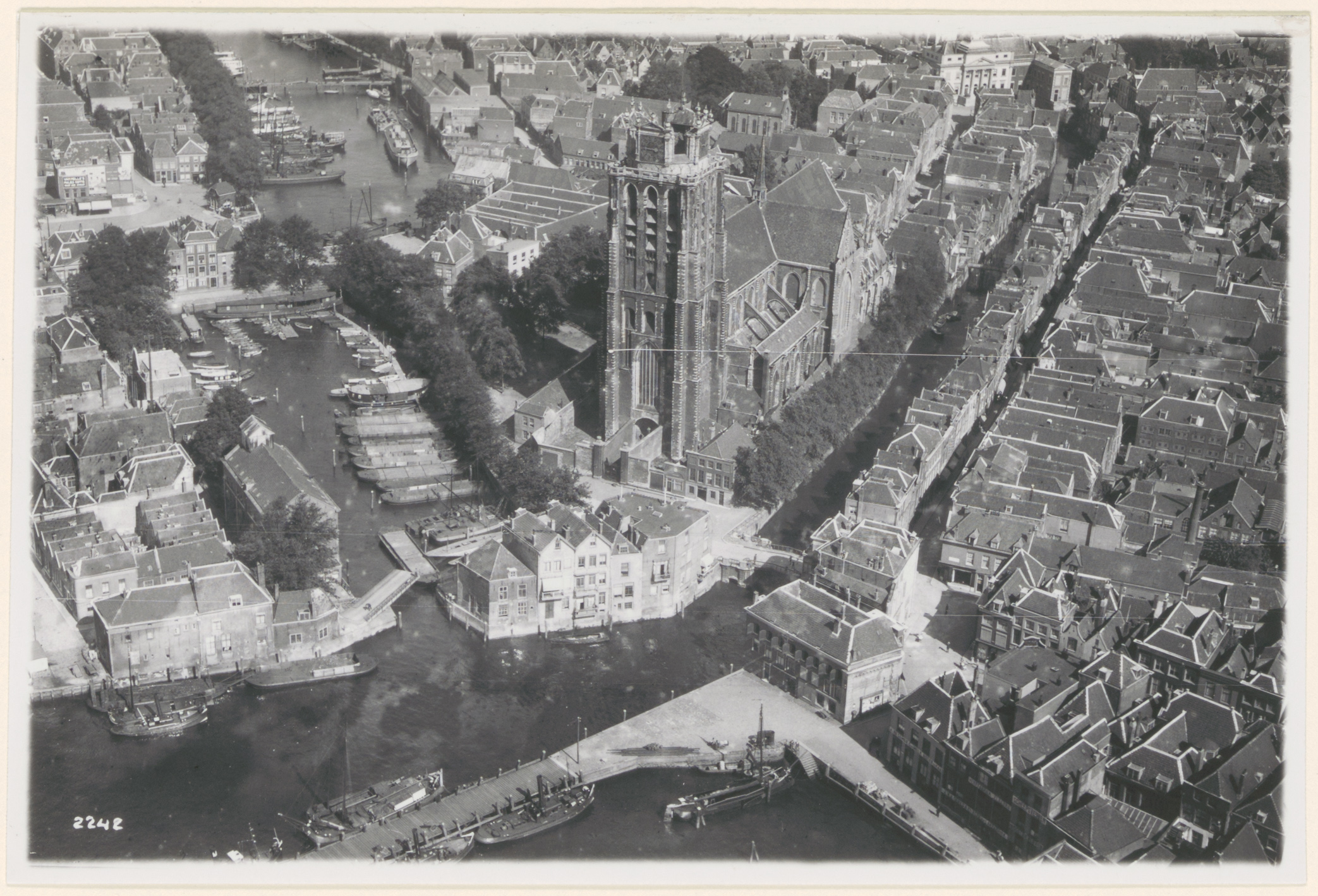 - Luchtfoto van het gebied rondom de Grote Kerk, Te onderscheiden zijn Bomkade, Bomhaven, Leuvehaven, Lange Geldersekade, Maartensgat, Pottenkade, Voorstraatshaven, Voorstraat.