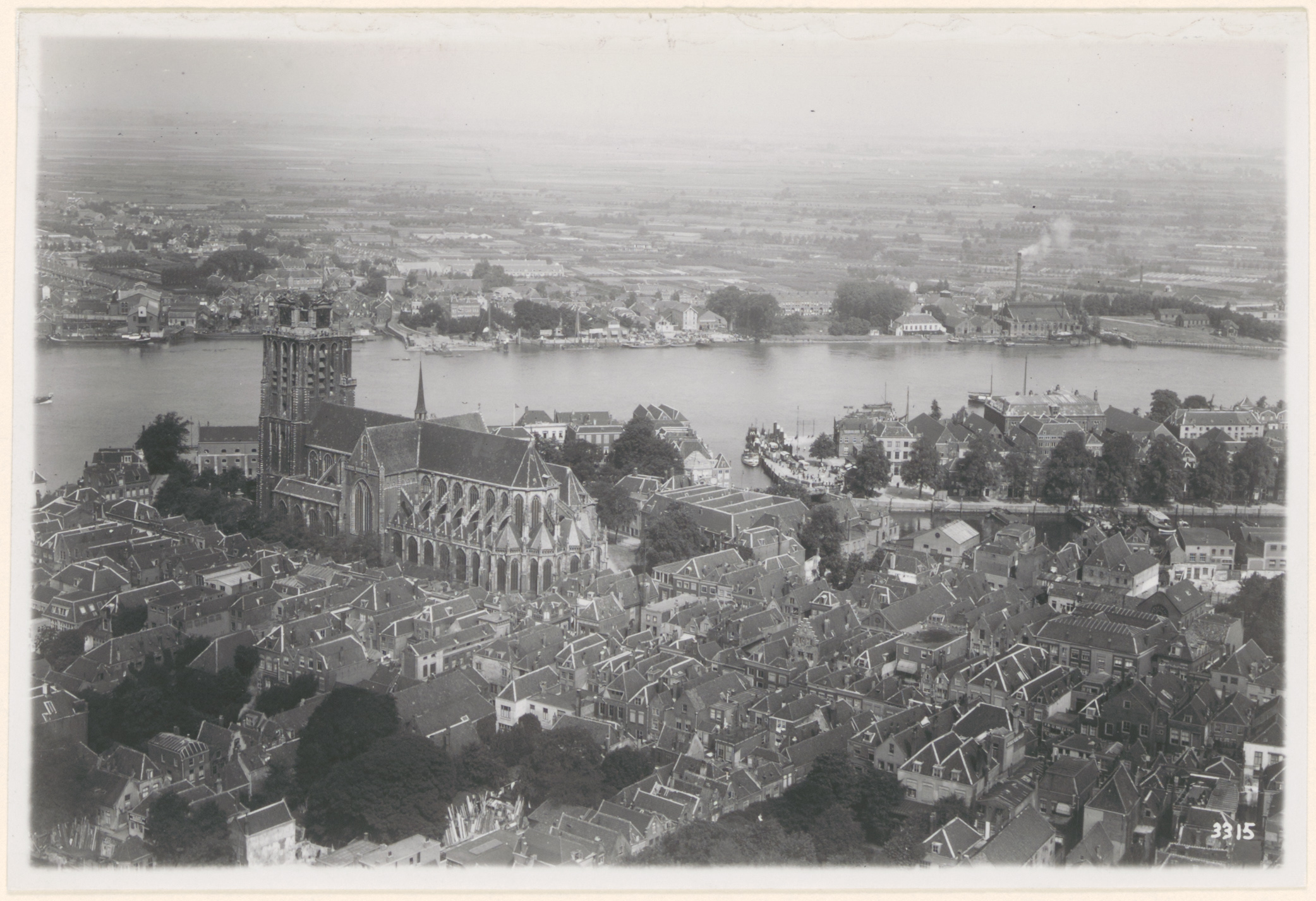 - Luchtfoto van het gebied rondom de Grote Kerk. Middenonder de Botgensstraat, rechtsmidden de Nieuwe Haven.