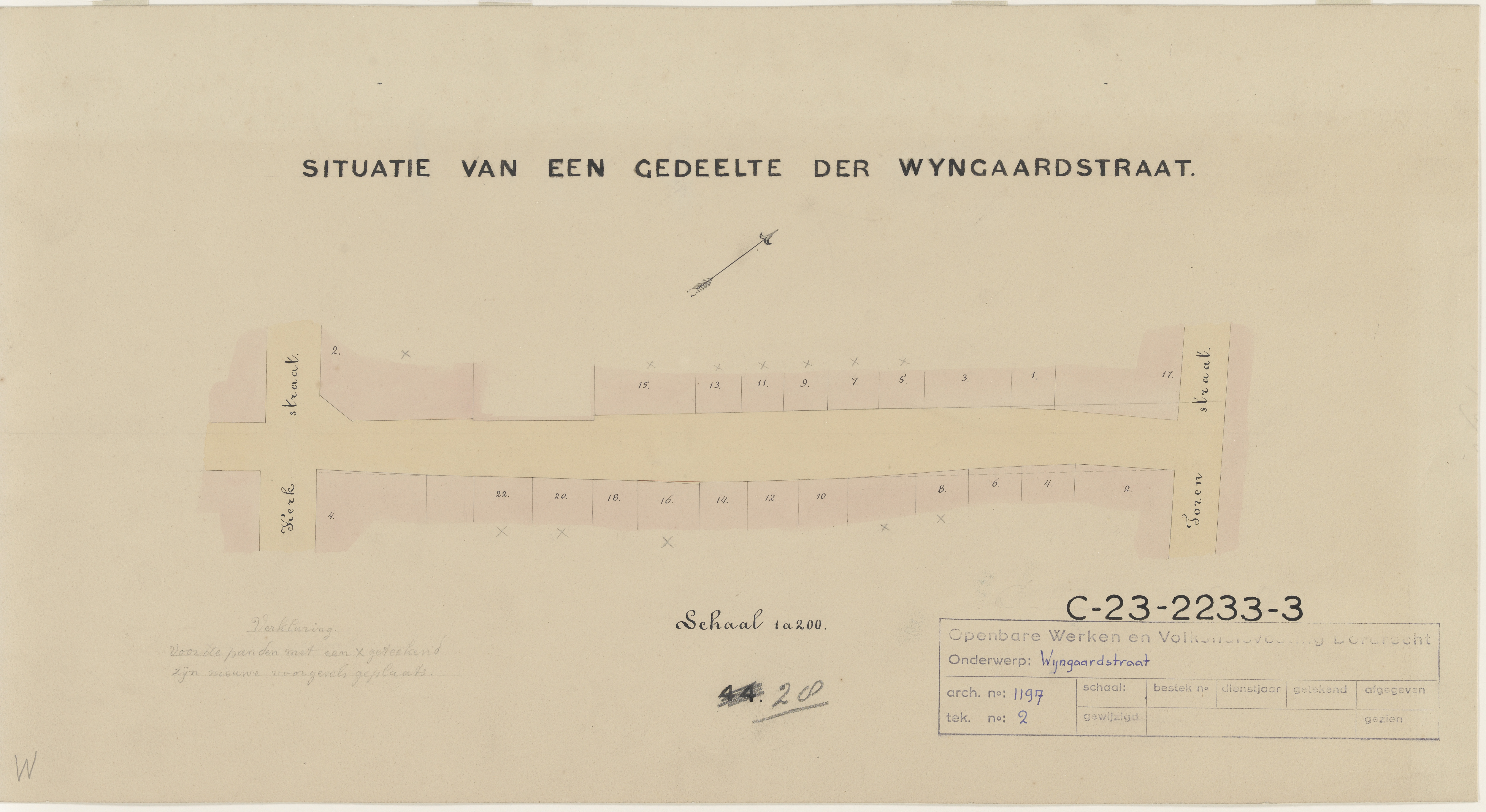 Plattegrond van de Wijngaardstraat tussen de Torenstraat en de Nieuwkerkstraat, …