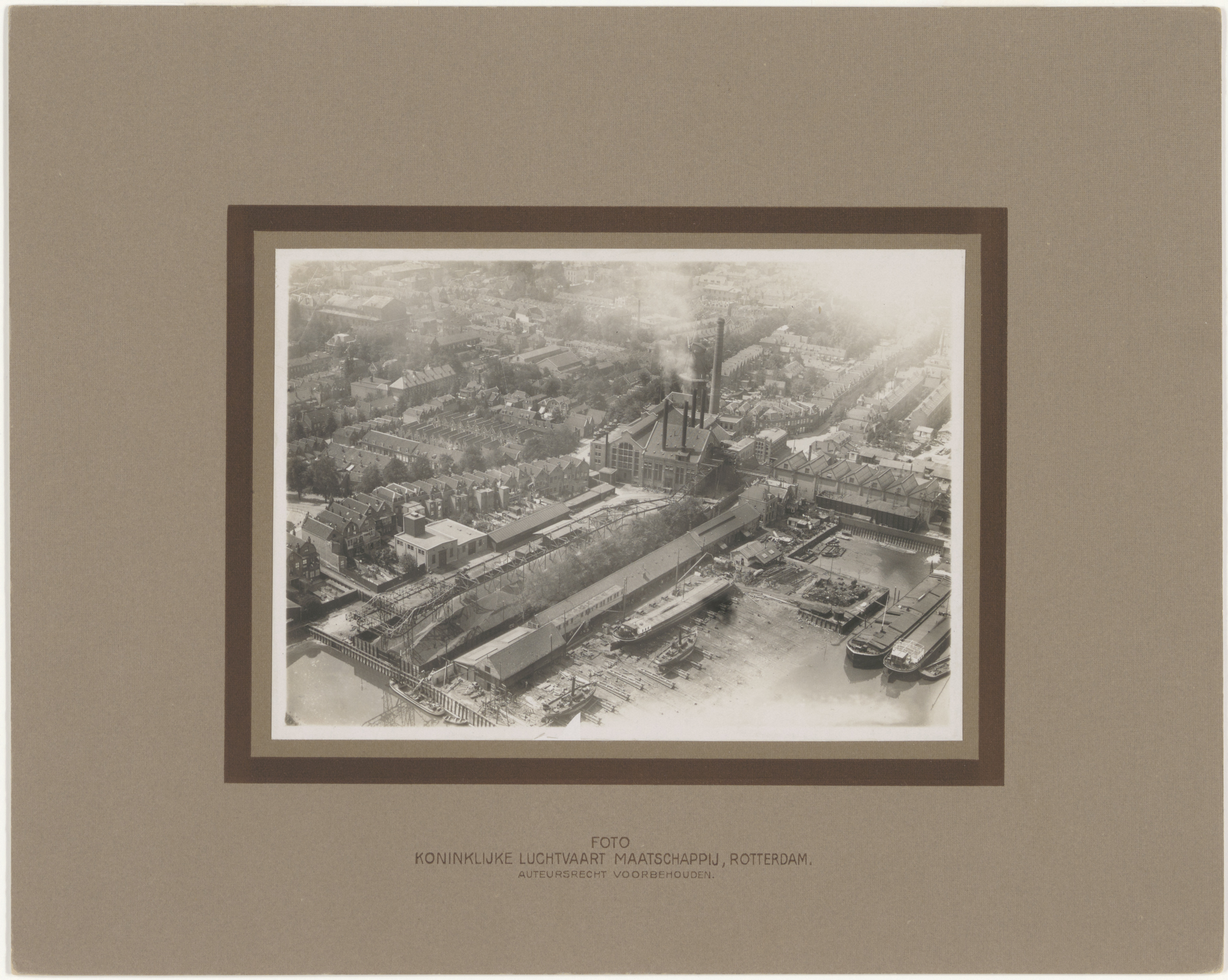 Luchtfoto van scheepswerf Hoebee en de elektriciteitscentrale aan de Noordendijk.