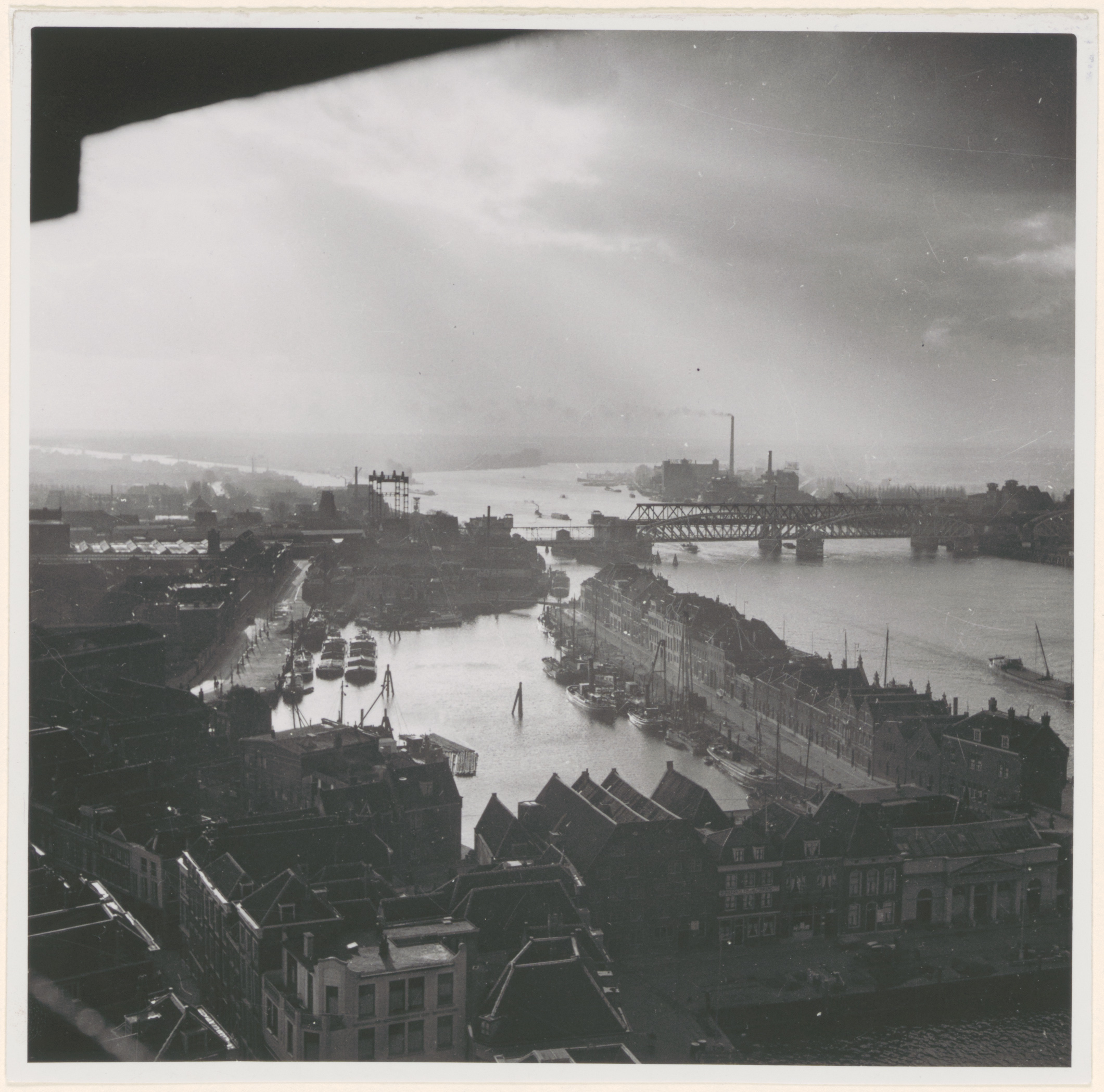 - Panorama vanaf de Grotekerkstoren op de Kalkhaven en de bruggen over de Oude Maas.