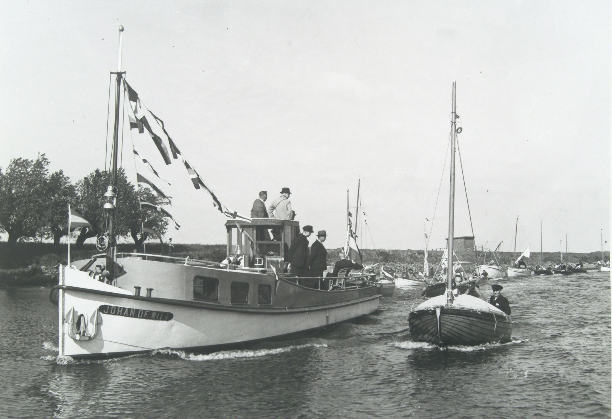 - Gemeentelijk representatieschip Johan de Witt met bootjes in de Hollandse Biesbosch