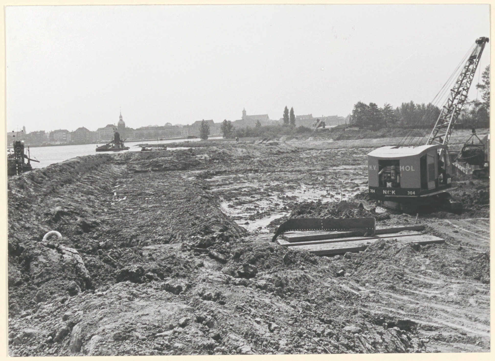 Het afgraven van het uitstekende gedeelte van de oever van de Noord ter verbreding van de riviersplitsing Noord - Oude Maas i.v.m.de duwvaart. Op de achtergrond is Dordrecht te zien.