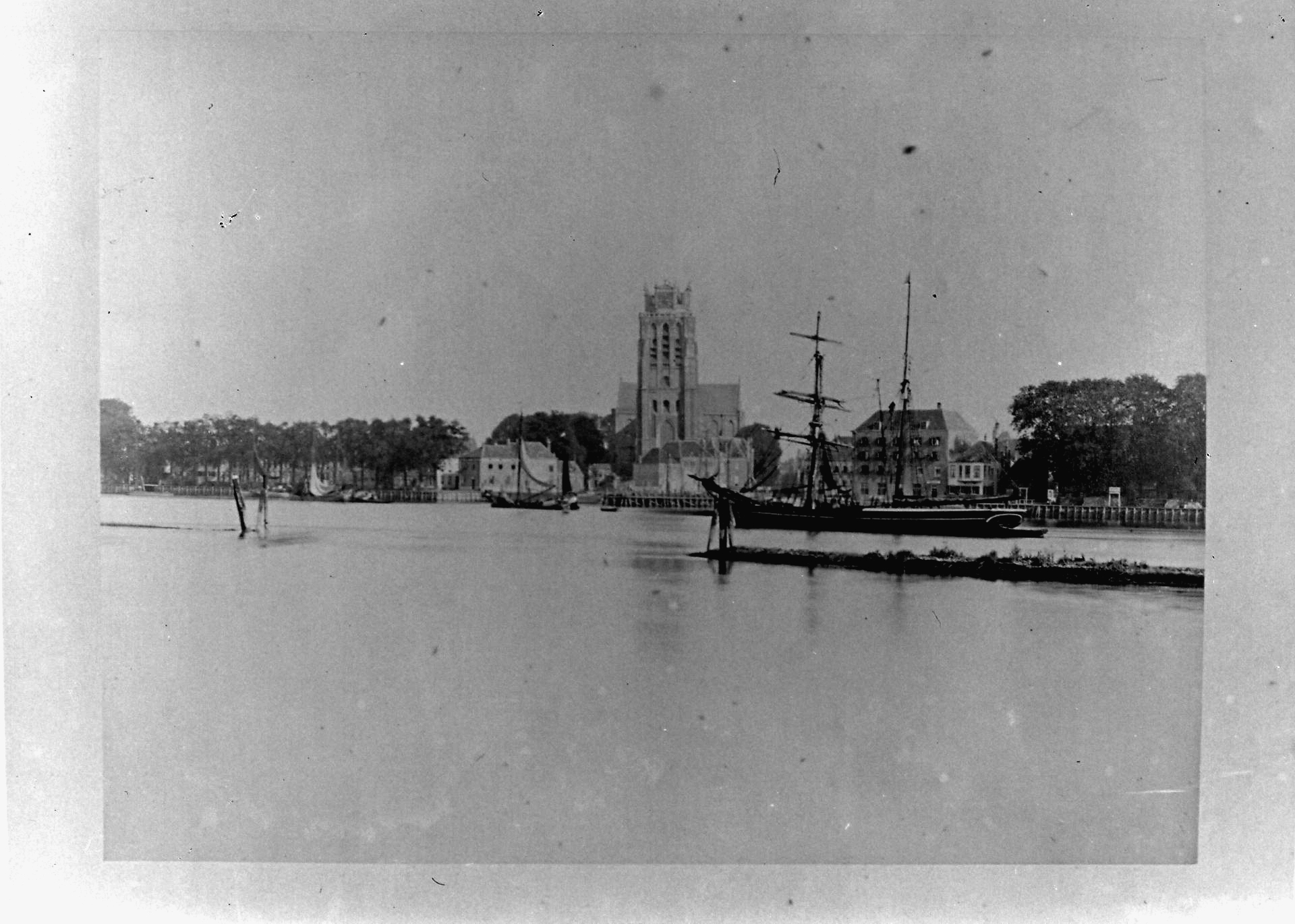 - De Grote Kerk vanaf de Zwijndrechtse oever. Links van de kerk ligt de Hooikade, rechts pakhuis Vredenburg aan de Bomkade.