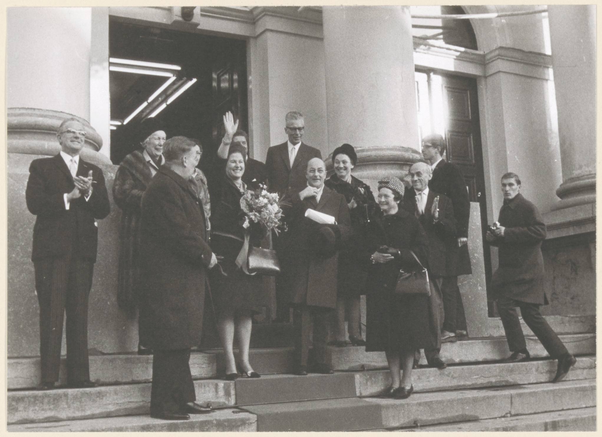 - Na de installatie en ambtsaanvaarding van burgemeester J.J. van der Lee staat het gezelschap op het bordes van het stadhuis. Aanwezigen: wethouders R.C. v. Leeuwen en P.J. v. Meurs, mevr. Van Leeuwen, mevr. Van Zuuren, mevr. Van der Lee, wethouder J.H. v. Zuuren, mr. J.P.A. v.d. Hoeven (gemeentesecretaris), burgemeester mr. J.J. v.d. Lee, mevr. Van Bohemen, mevr. Van Meurs en wethouder L. v. Bohemen.