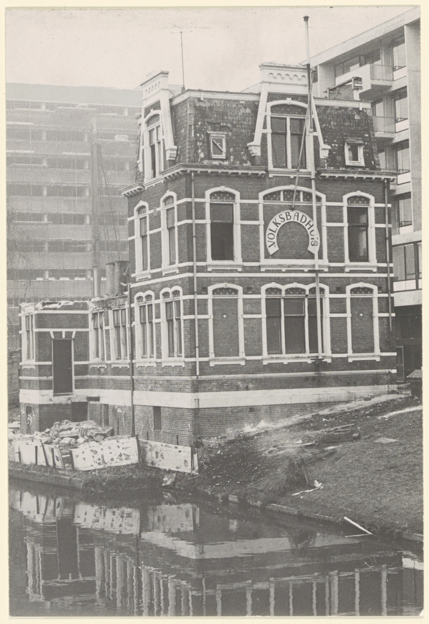 - Het volksbadhuis aan de Vest langs de Spuihaven, iets ten westen van de Johan de Wittbrug, naar het westen gezien, vlak voor de afbraak.