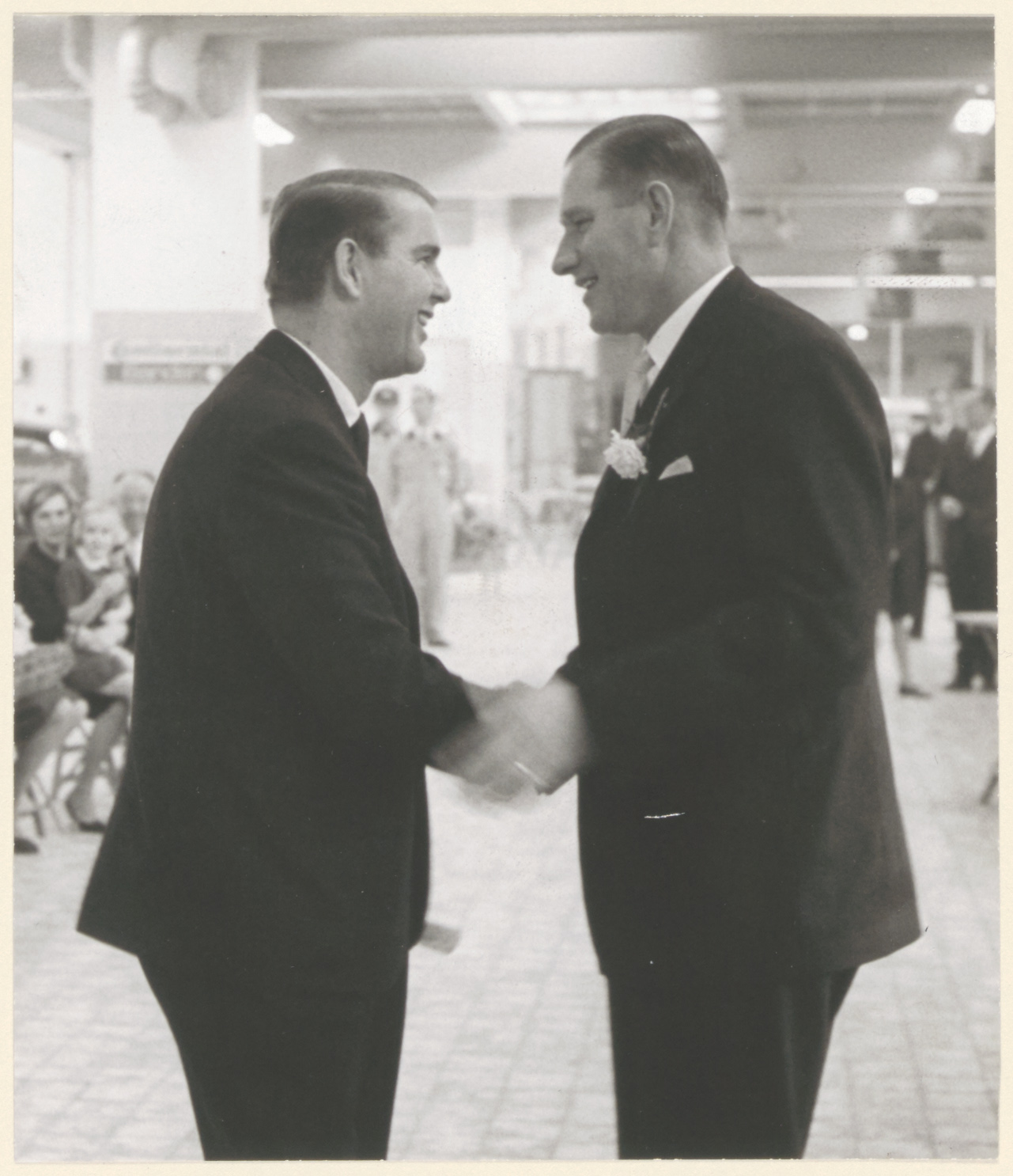 - De heer Jan Ames wordt gefeliciteerd door de heer Ben Pon jr. t.g.v. het openen van de nieuwe garage aan de Johan de Wittstraat.